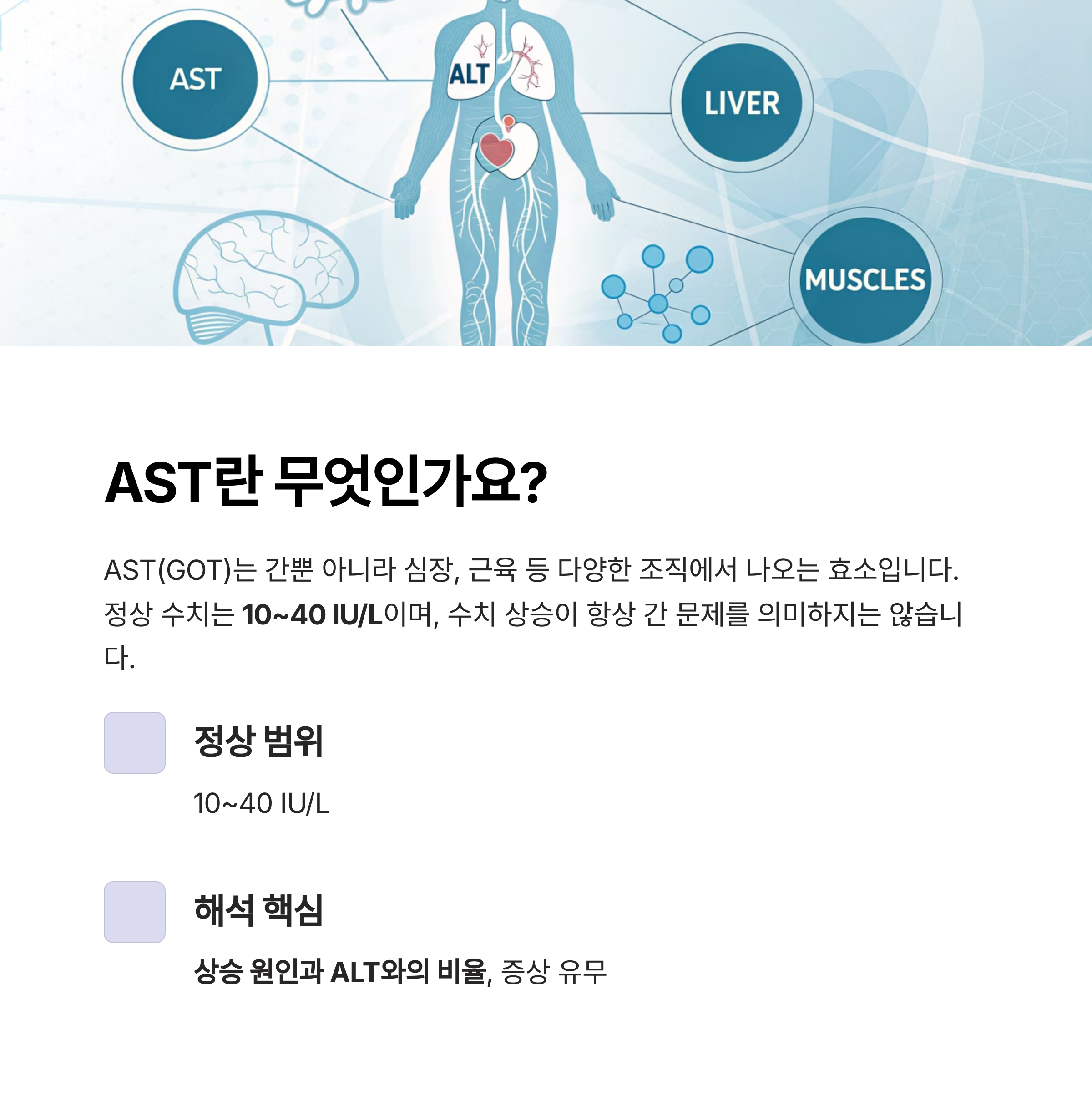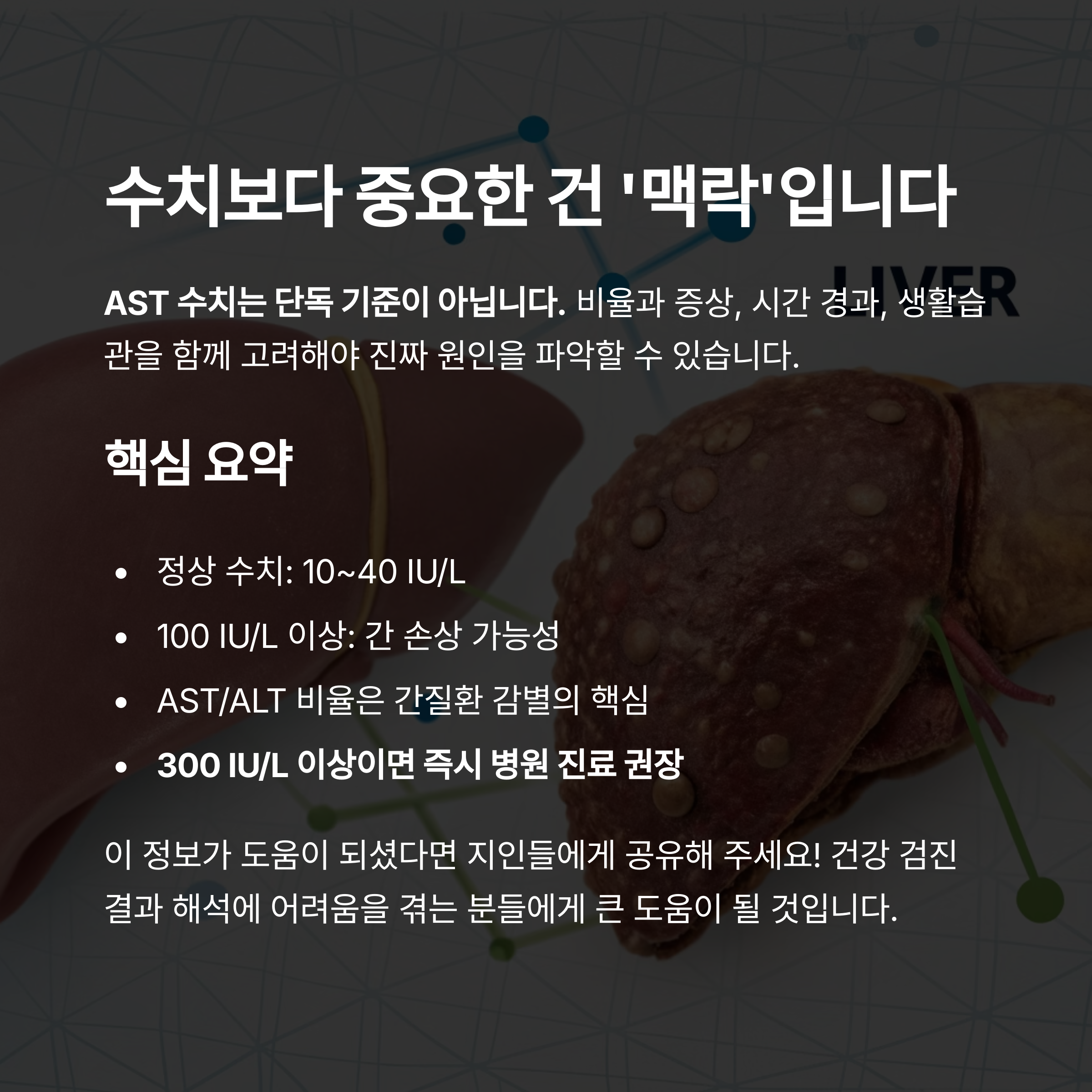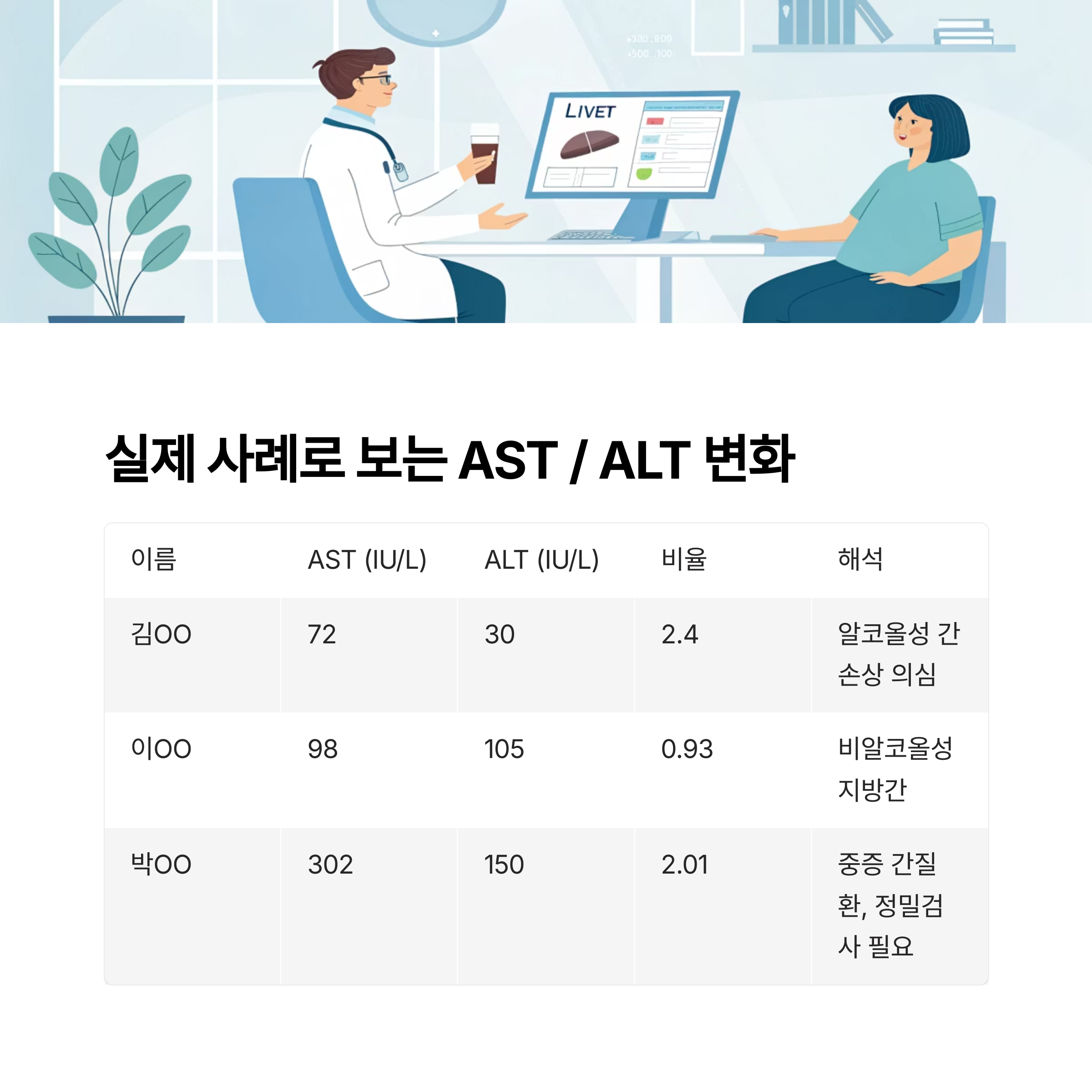 중요: 단독 AST 수치보다 ALT와의 비율이 간질환 감별에 더욱 효과적입니다.