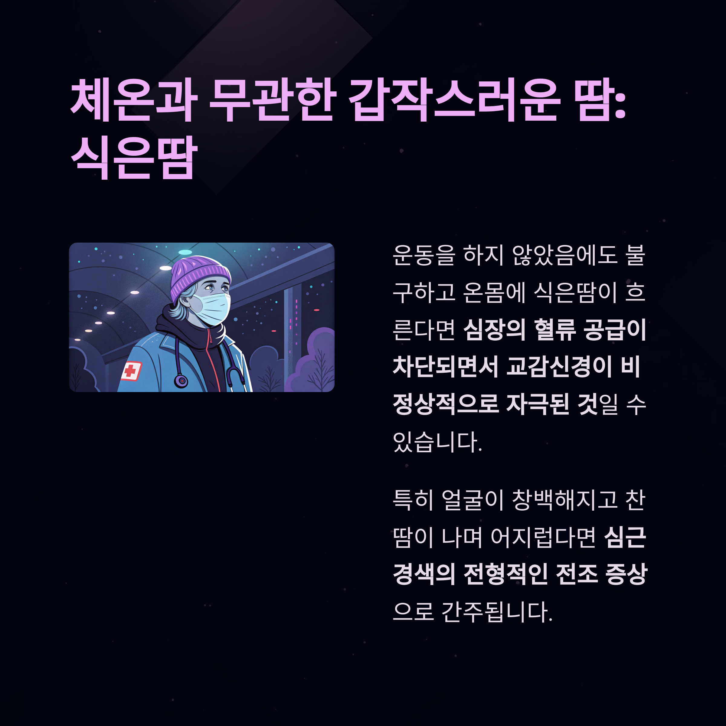 식은땀: 체온과 무관하게 갑자기 나는 땀