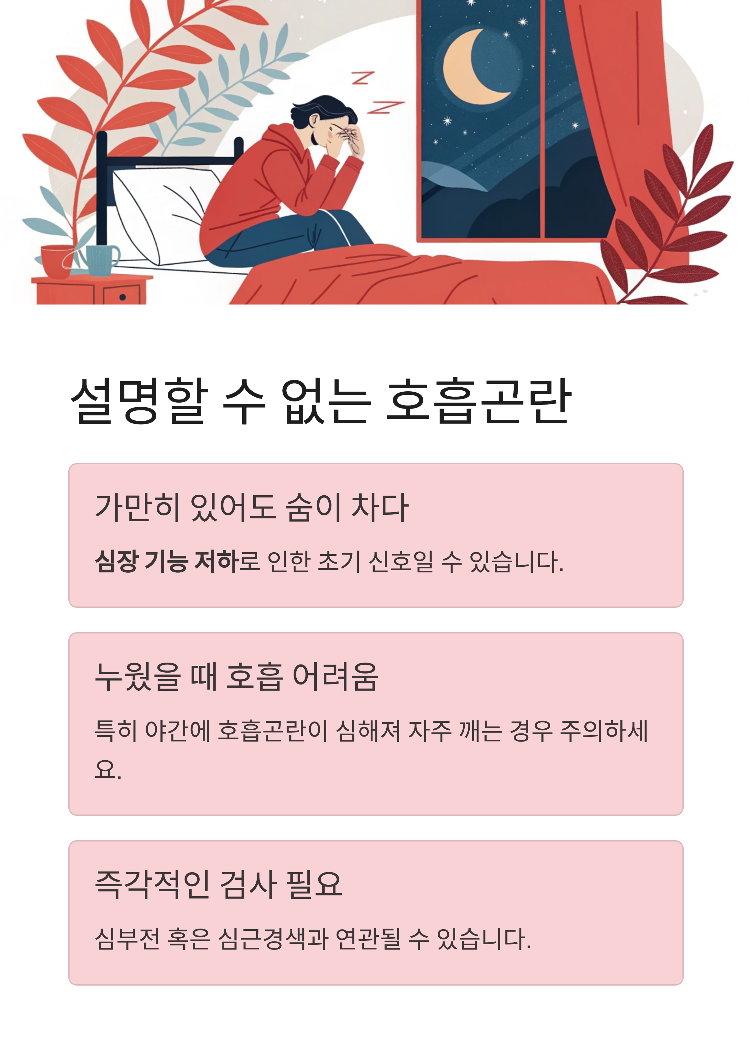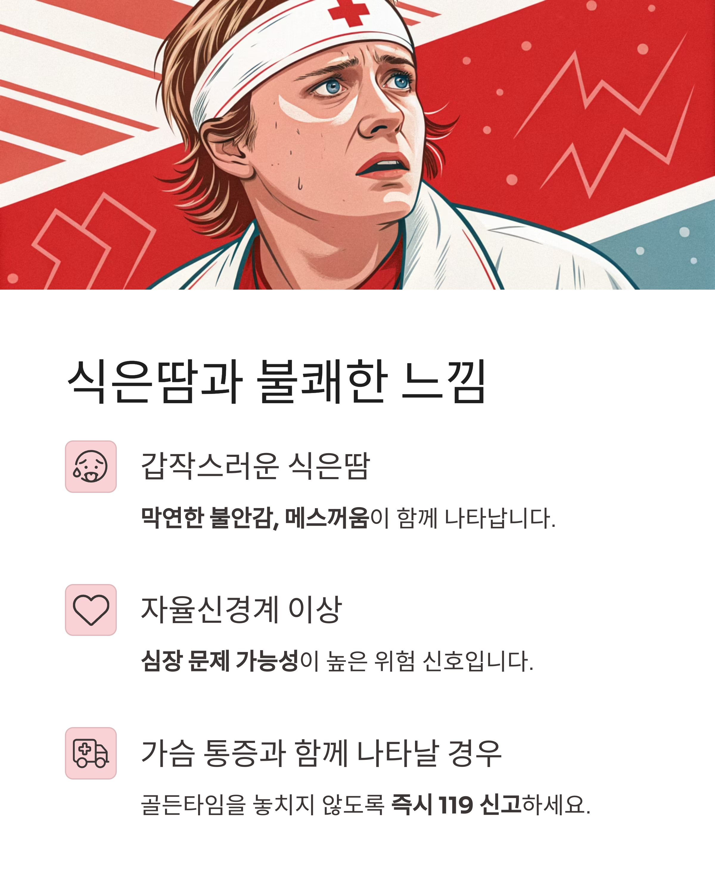 | 식은땀 및 호흡곤란 | 급성 발작 가능성 경고 |