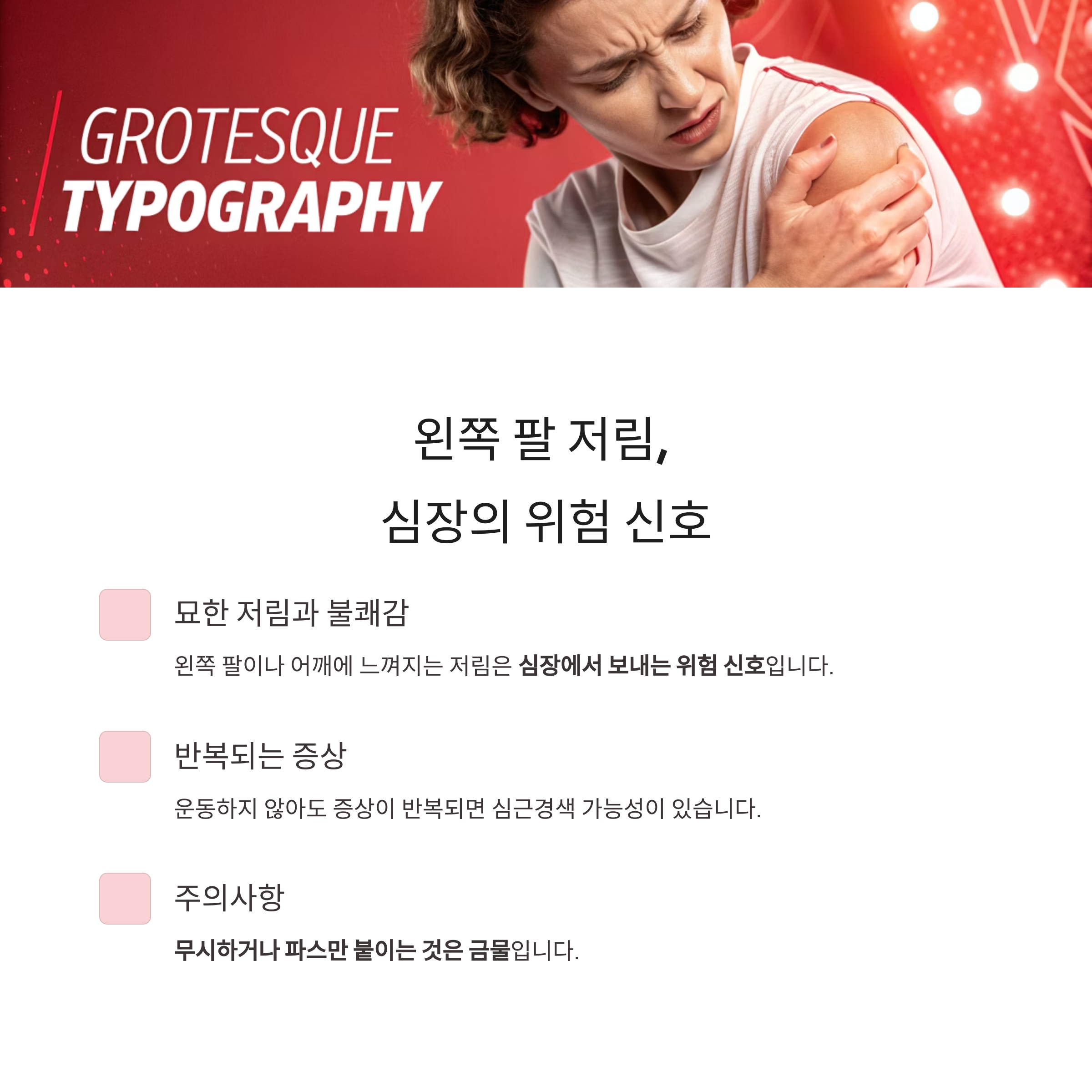 | 왼쪽 어깨·팔로 퍼지는 통증 | 심근경색 대표 전조 증상 |