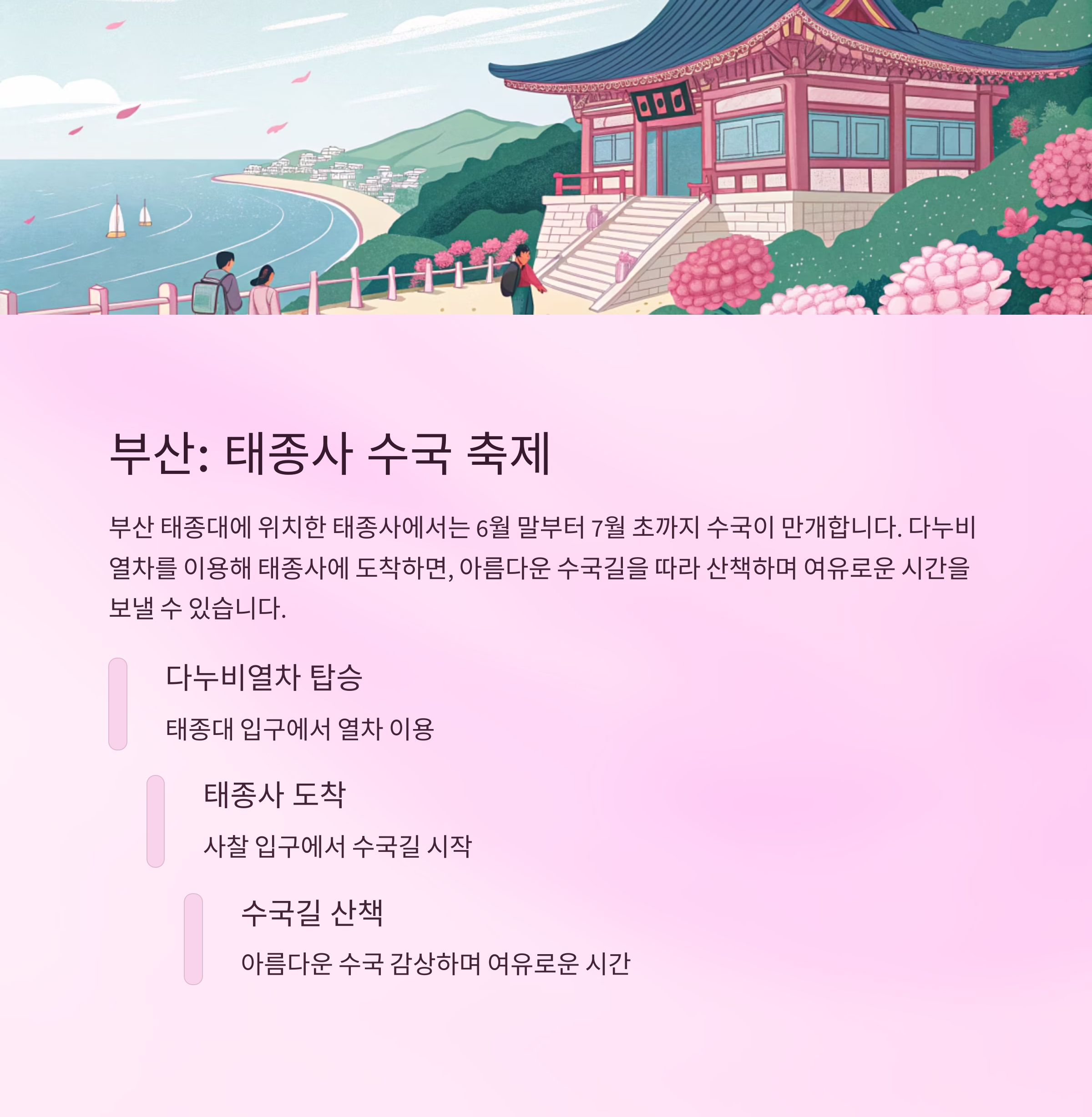 | 부산 | 6월 말~7월 초 | 태종사 수국 축제 |