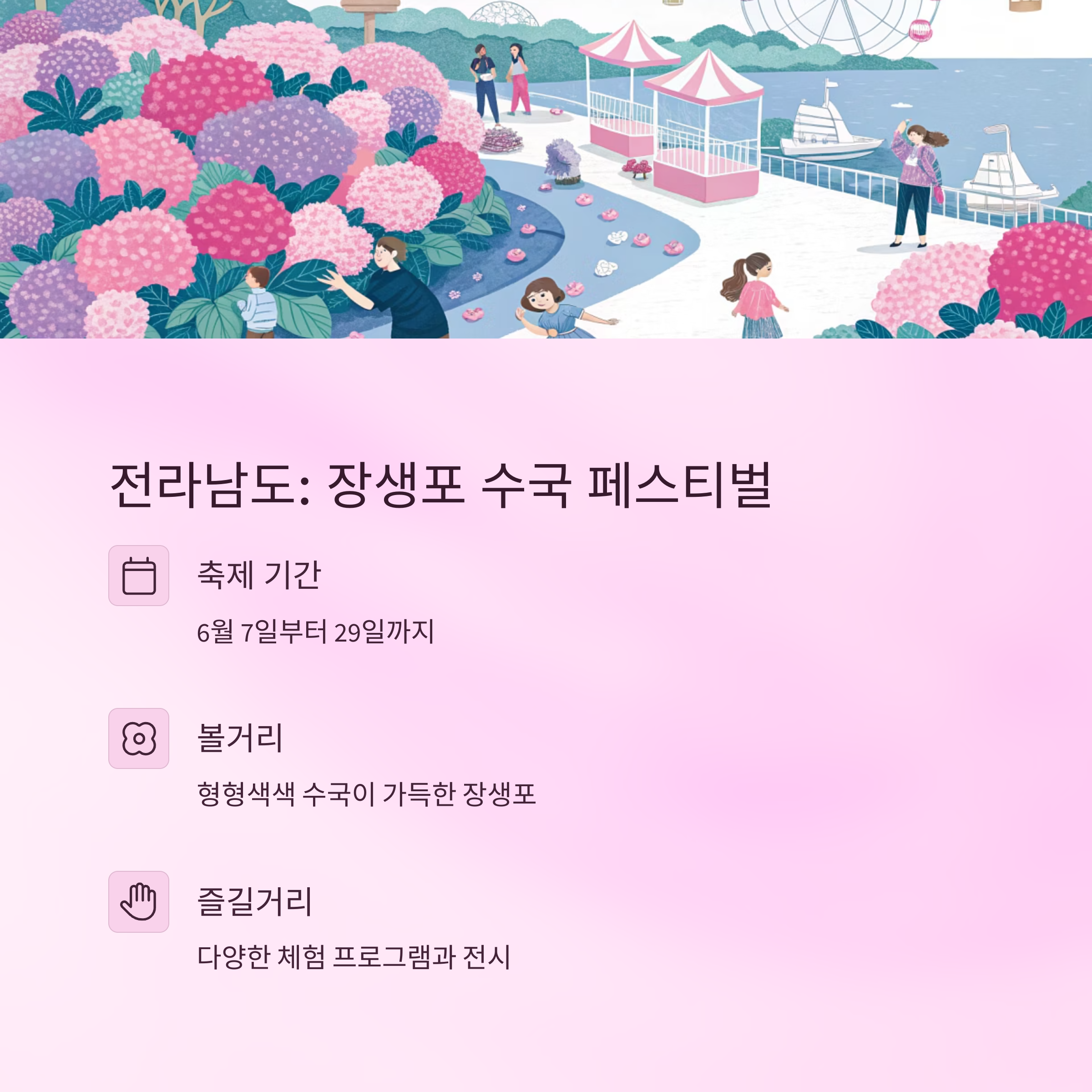 | 전라남도 | 6월 7일~6월 29일 | 장생포 수국 페스티벌 |