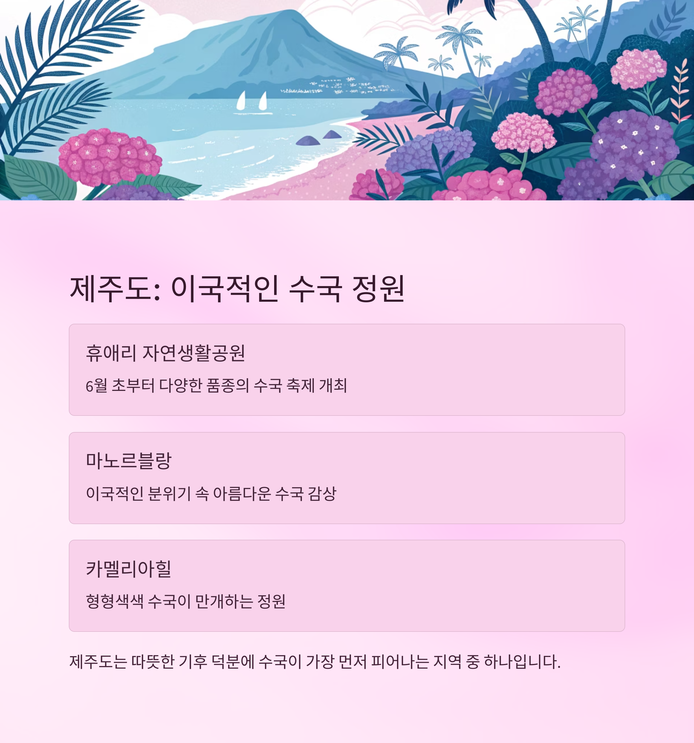 제주도는 따뜻한 기후 덕분에 수국이 가장 먼저 피어나는 지역 중 하나입니다. 특히 휴애리 자연생활공원에서는 6월 초부터 다양한 품종의 수국을 감상할 수 있는 수국 축제가 열립니다. 또한 마노르블랑과 카멜리아힐에서도 형형색색의 수국이 아름답게 피어납니다.