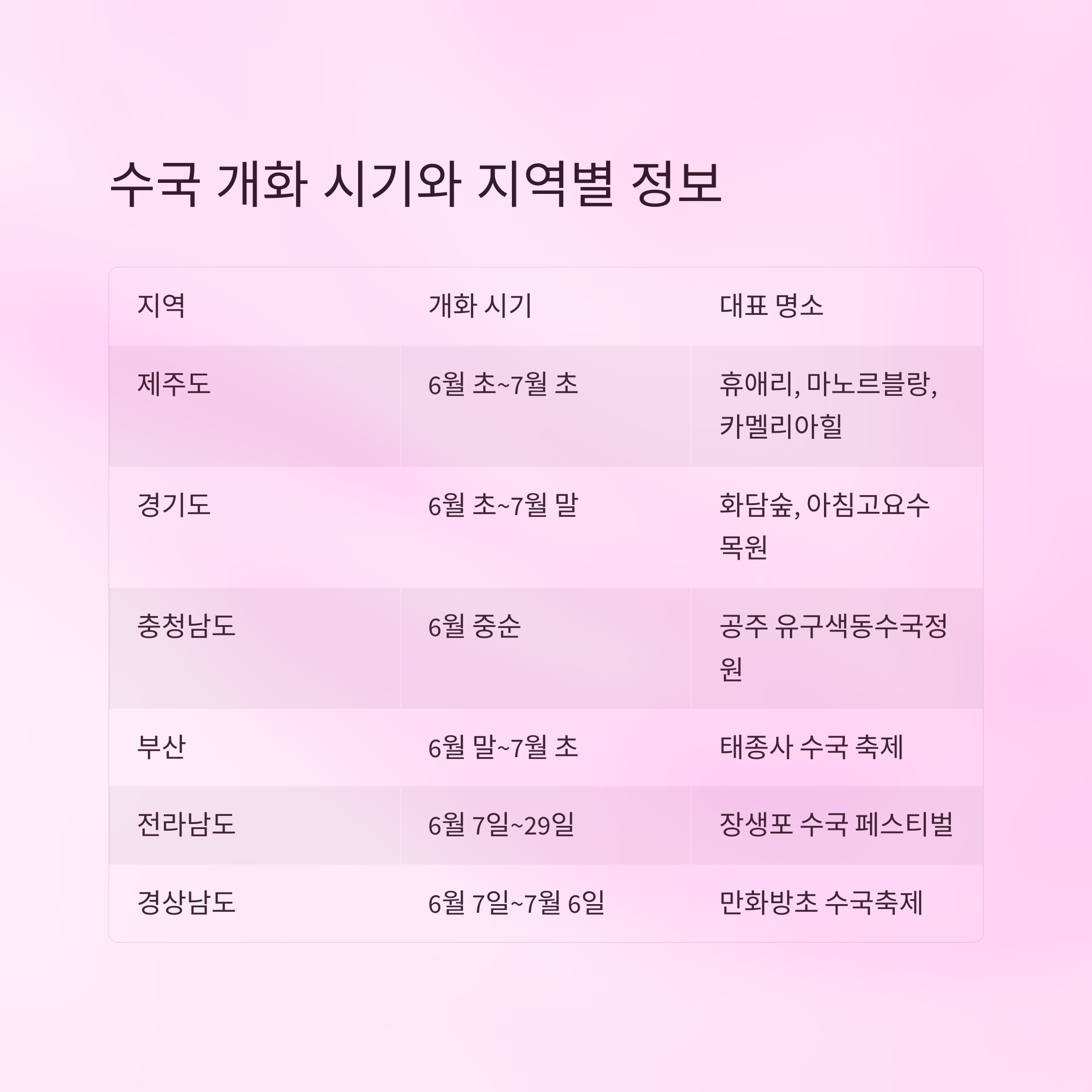 | 제주도 | 6월 초~7월 초 | 휴애리 자연생활공원, 마노르블랑, 카멜리아힐 |