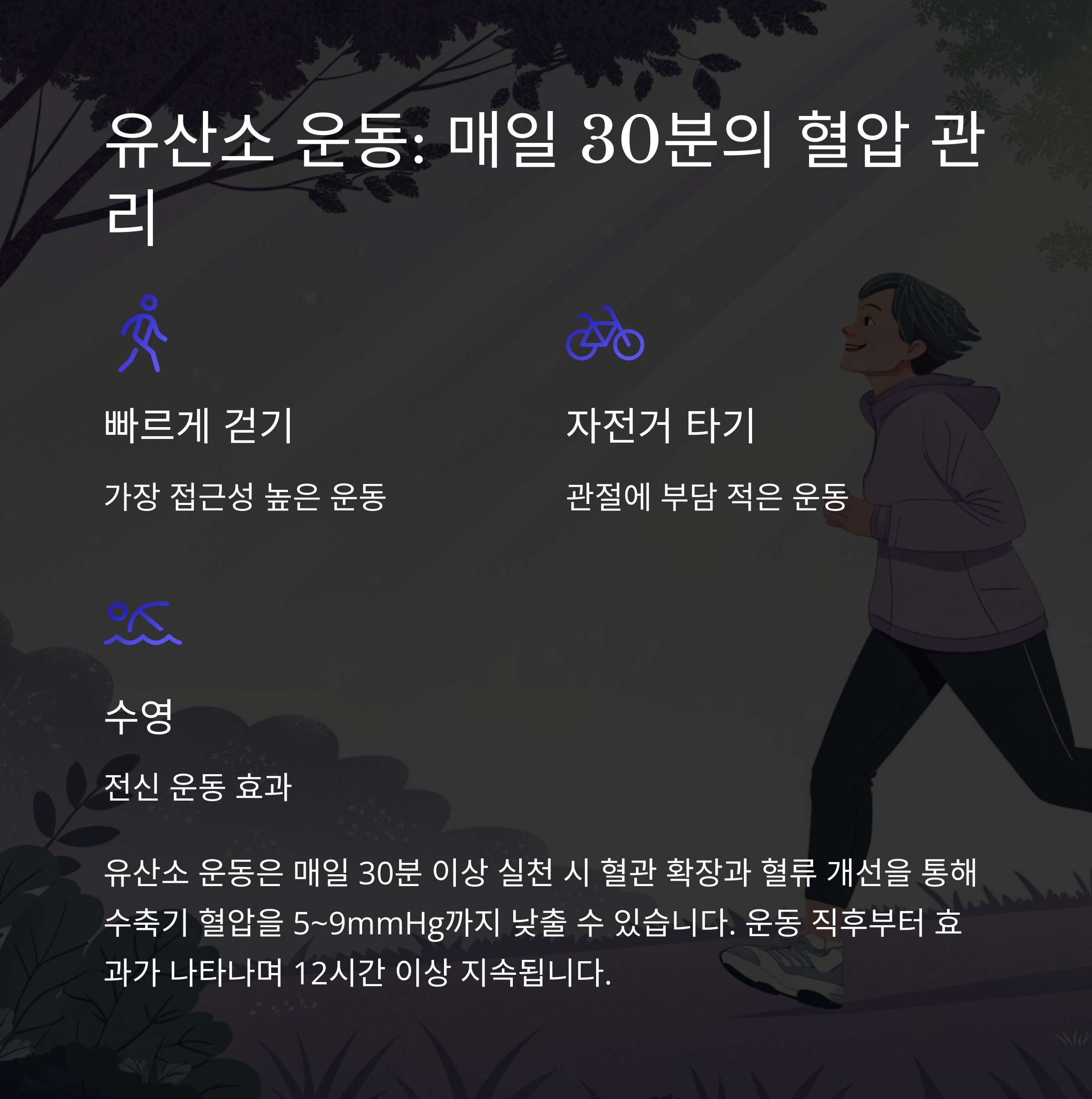 유산소 운동은 운동 직후부터 12시간 이상 혈압 저하 효과가 유지됩니다.