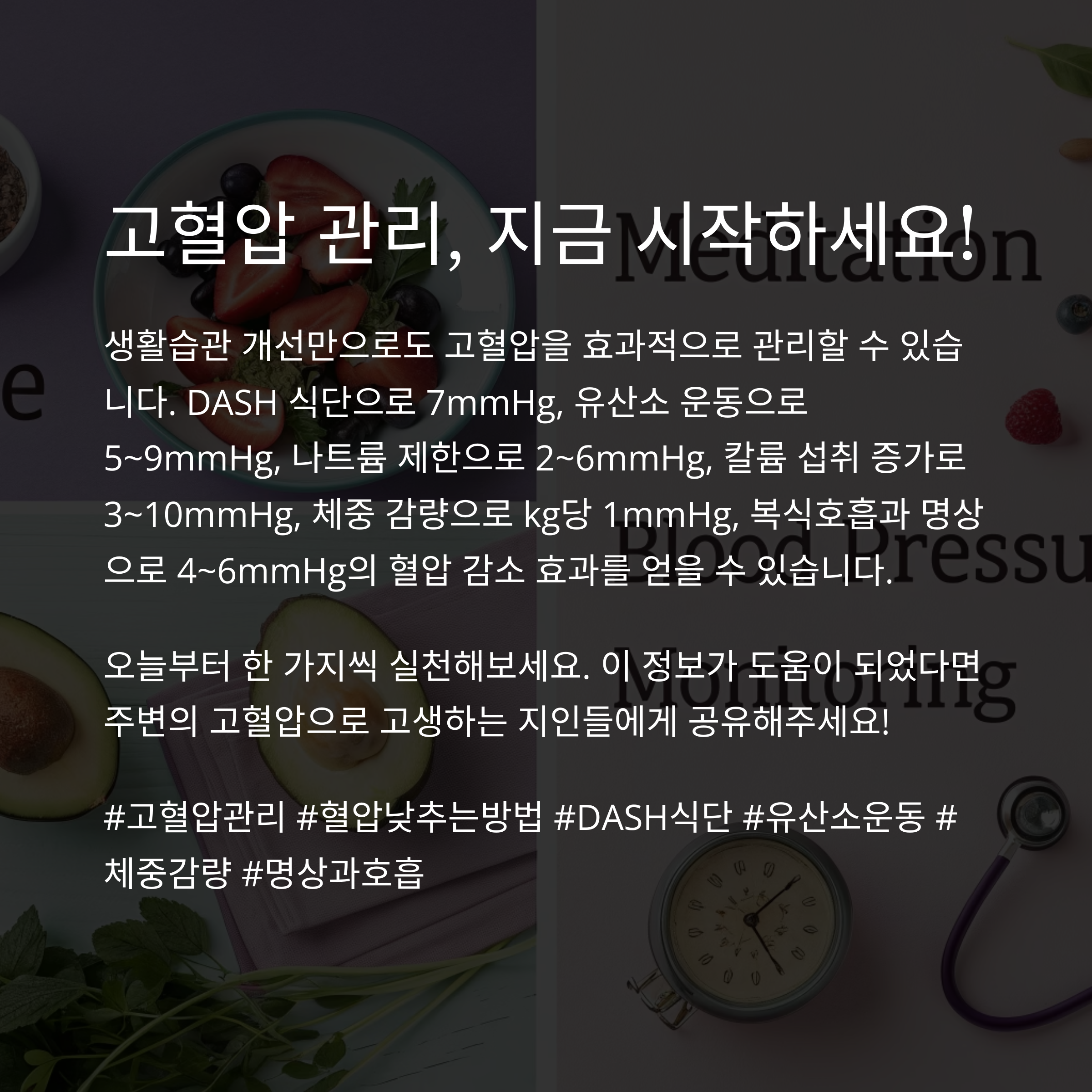 | DASH 식단 | -7mmHg | 채소, 과일, 저염식 |