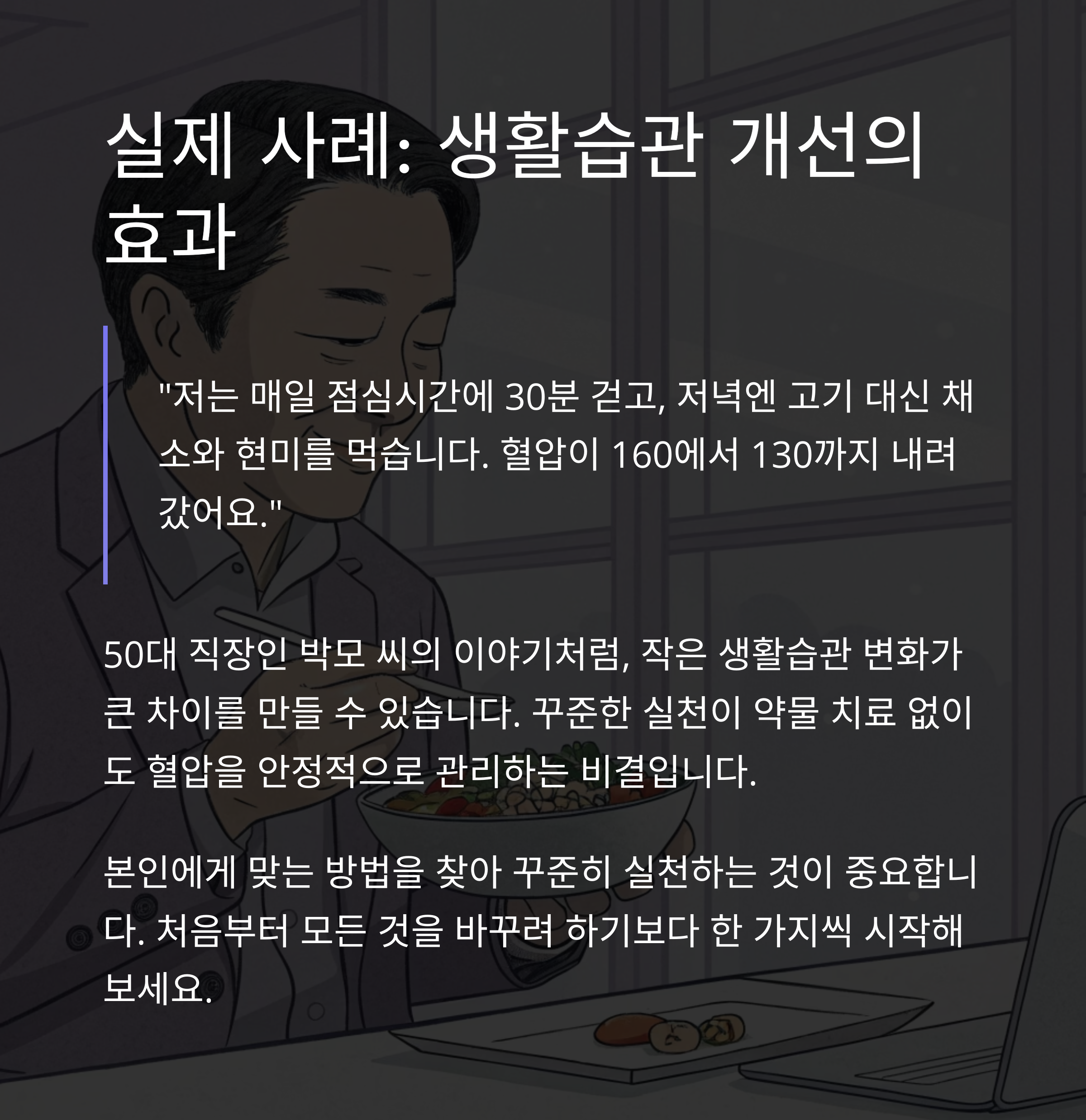 고혈압은 생활습관을 개선하면 약 없이도 안정적으로 조절할 수 있는 대표적인 만성 질환입니다.