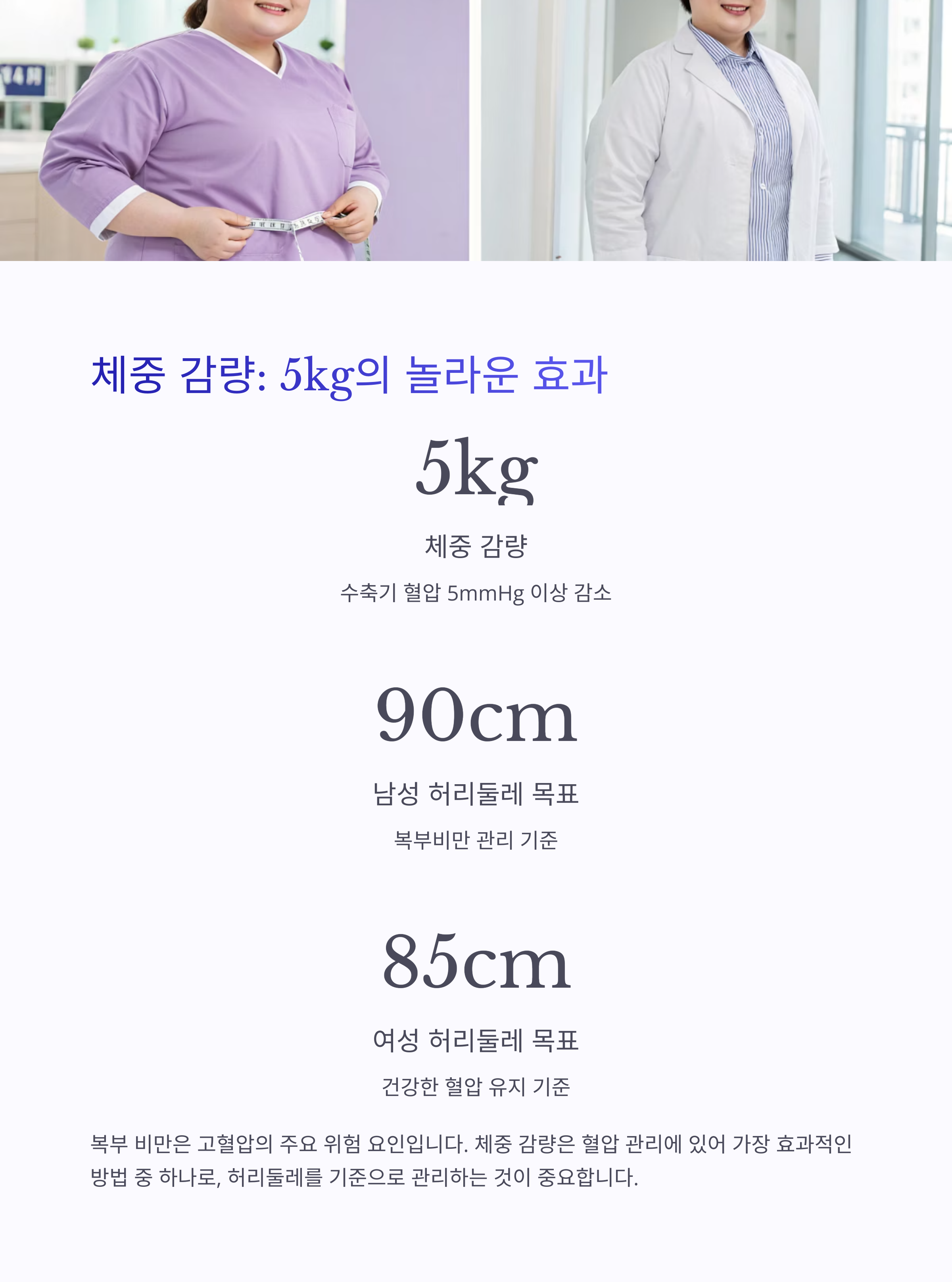 체중이 5kg만 줄어도 수축기 혈압이 5mmHg 이상 감소할 수 있습니다.