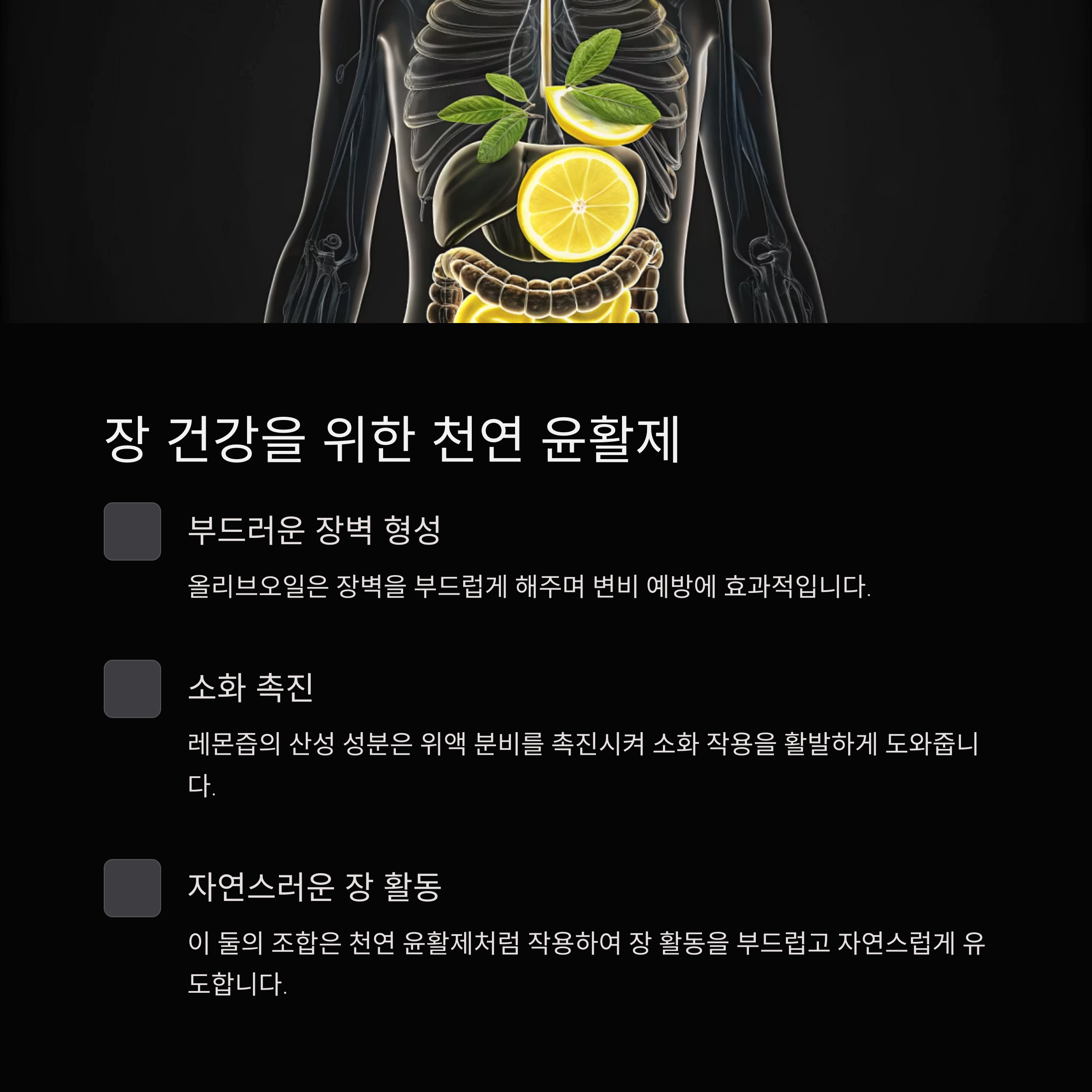 올리브오일은 장벽을 부드럽게 해주며, 변비 예방에 효과적입니다. 레몬즙의 산성 성분은 위액
