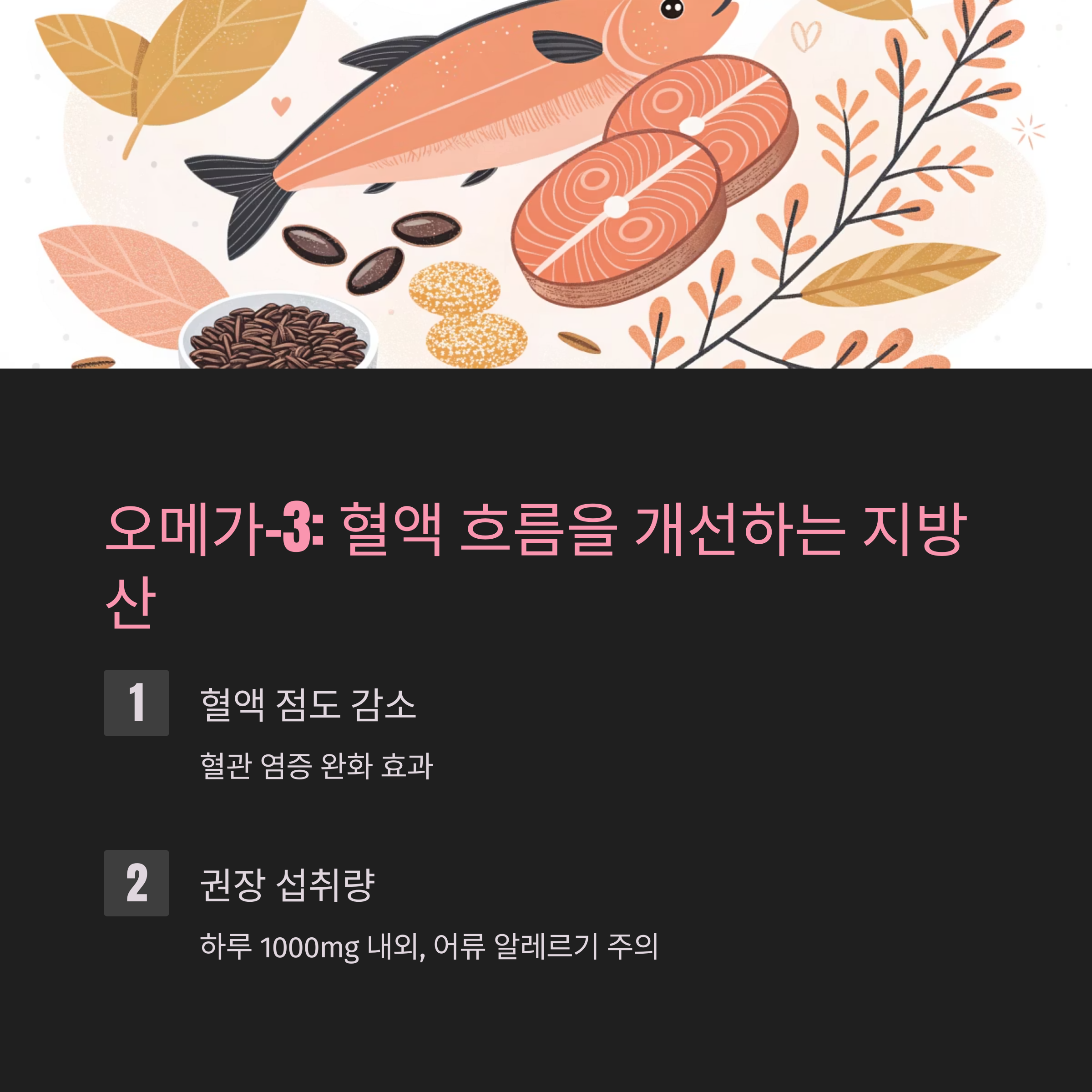 | 오메가-3 | 혈액 점도 낮춤, 염증 완화 | 어류 알레르기 주의 |