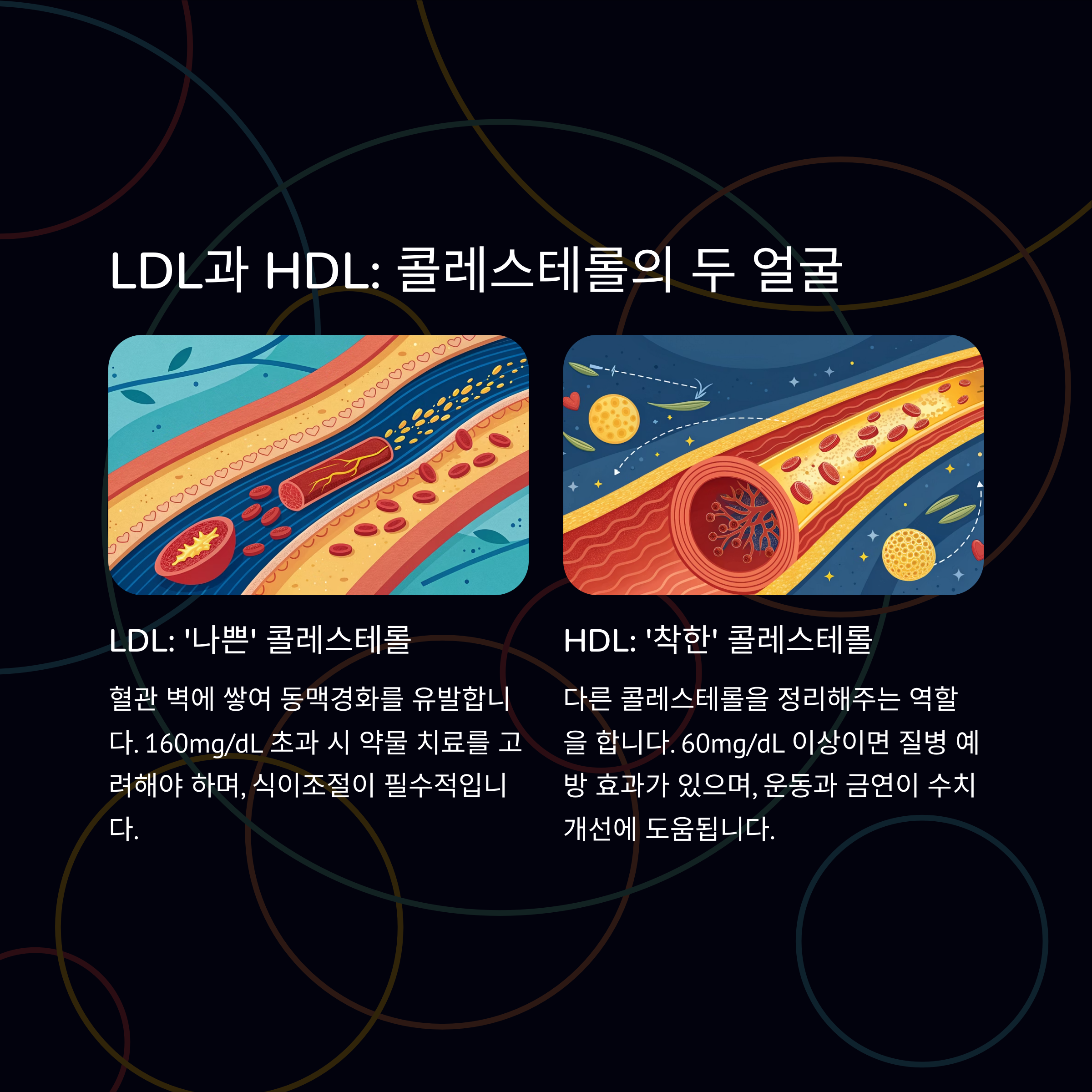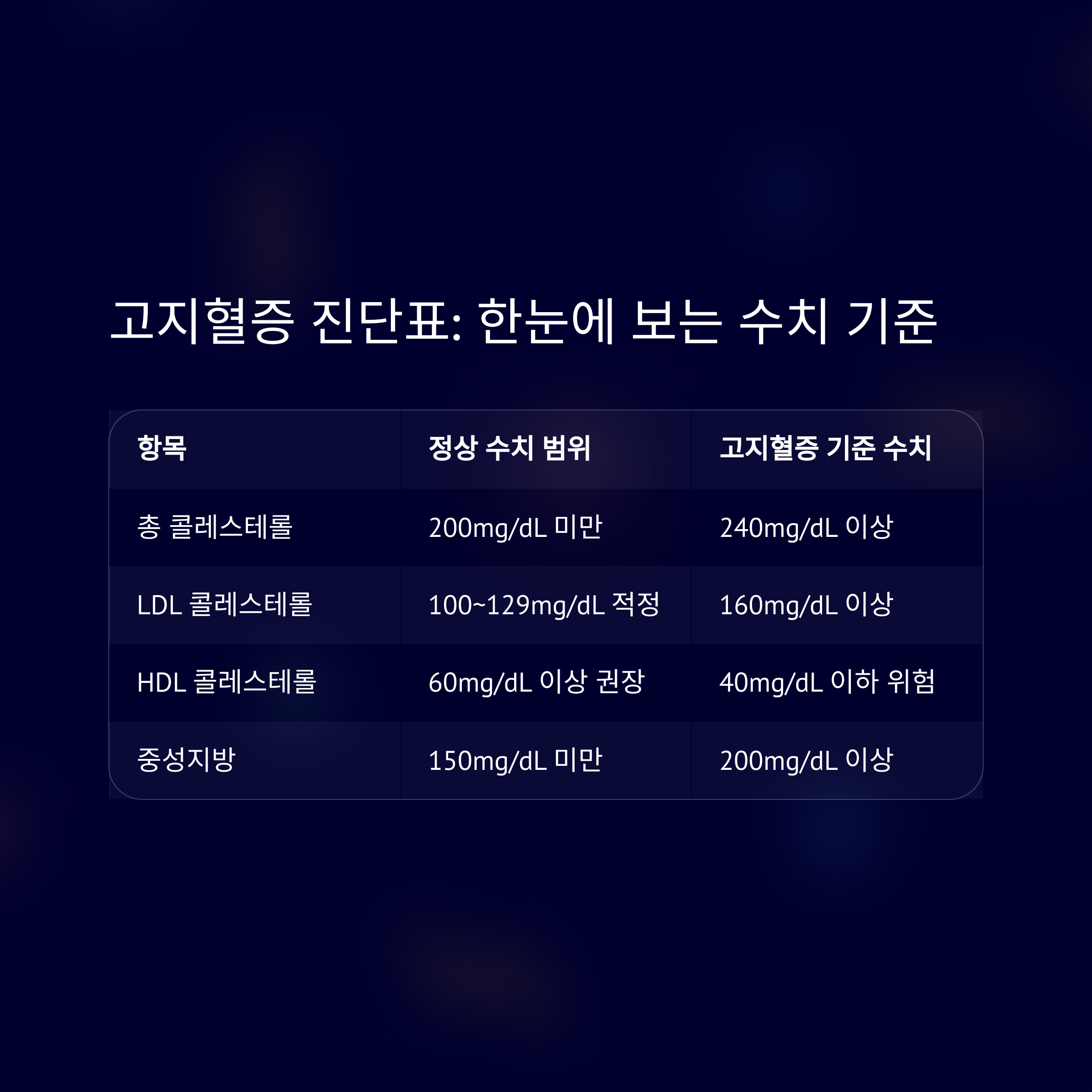 | HDL 콜레스테롤 | 60mg/dL 이상 권장 | 40mg/dL 이하 위험 |
