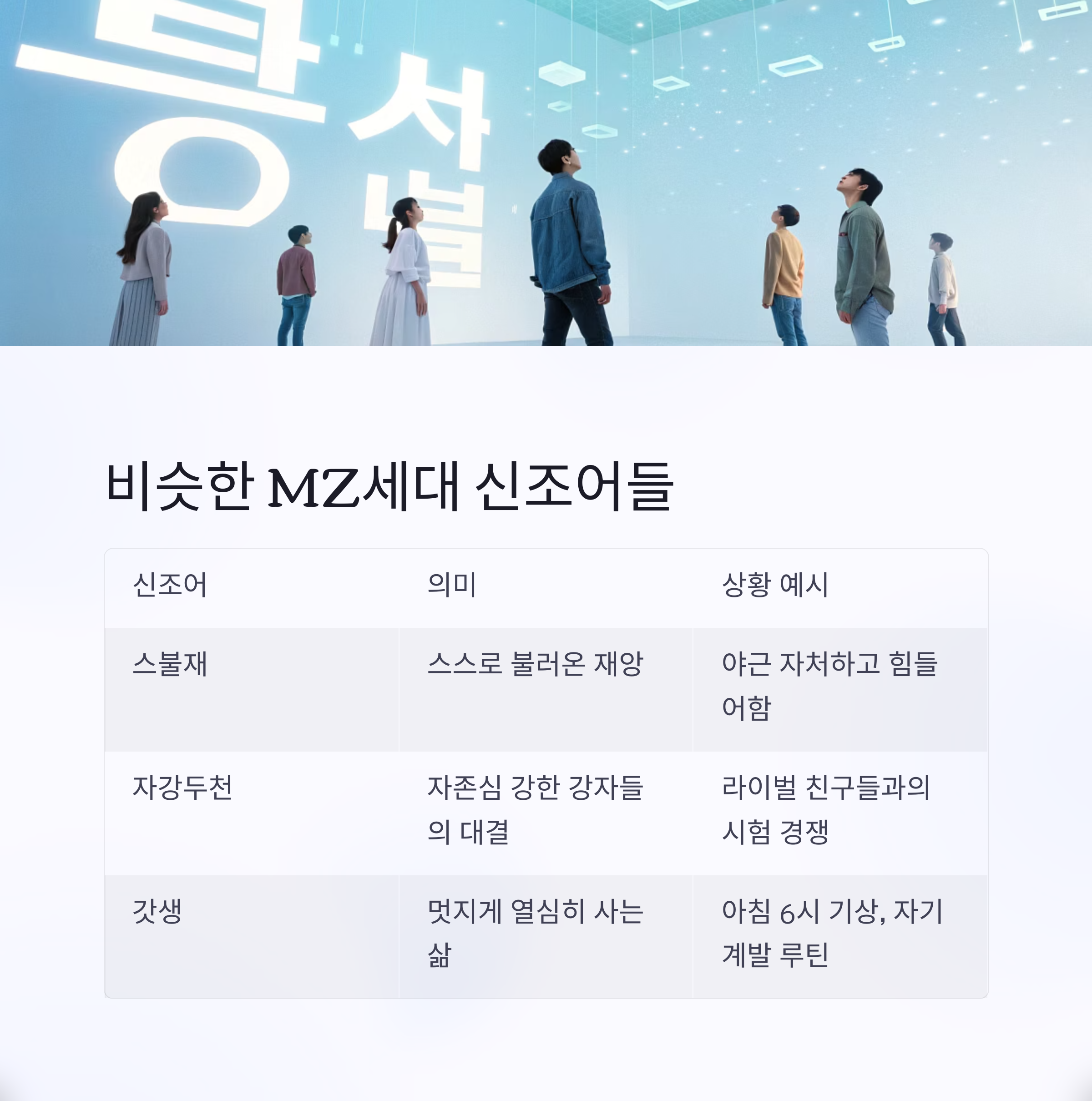 | 갓생 | 멋지게 열심히 사는 삶 | 아침 6시 기상, 자기계발 루틴 실행 |
