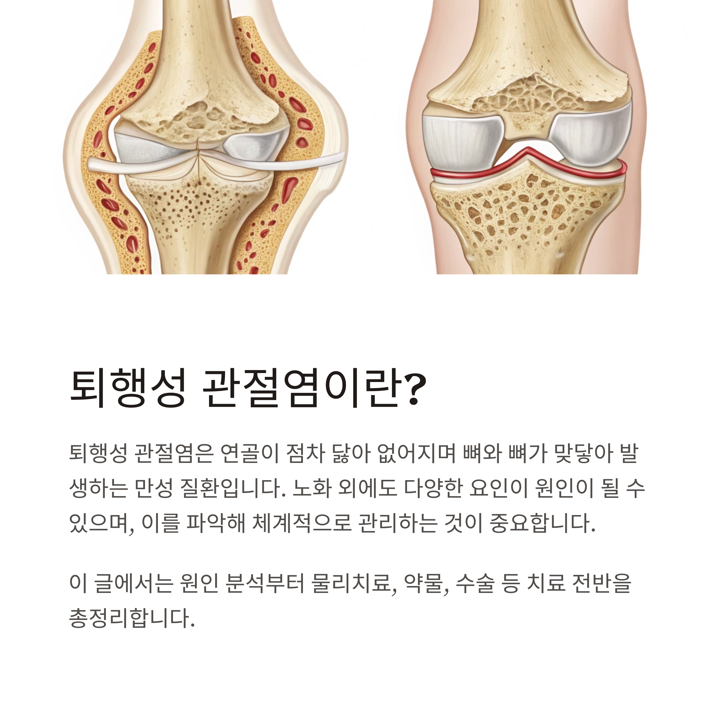 퇴행성 관절염은 연골이 점차 닳아 없어지며 뼈와 뼈가 맞닿아 발생하는 만성 질환입니다. 노화 외에도 다양한 요인이 원인이 될 수 있으며, 이를 파악해 체계적으로 관리하는 것이 중요합니다. 이 글에서는 원인 분석부터 물리치료, 약물, 수술 등 치료 전반을 총정리합니다.