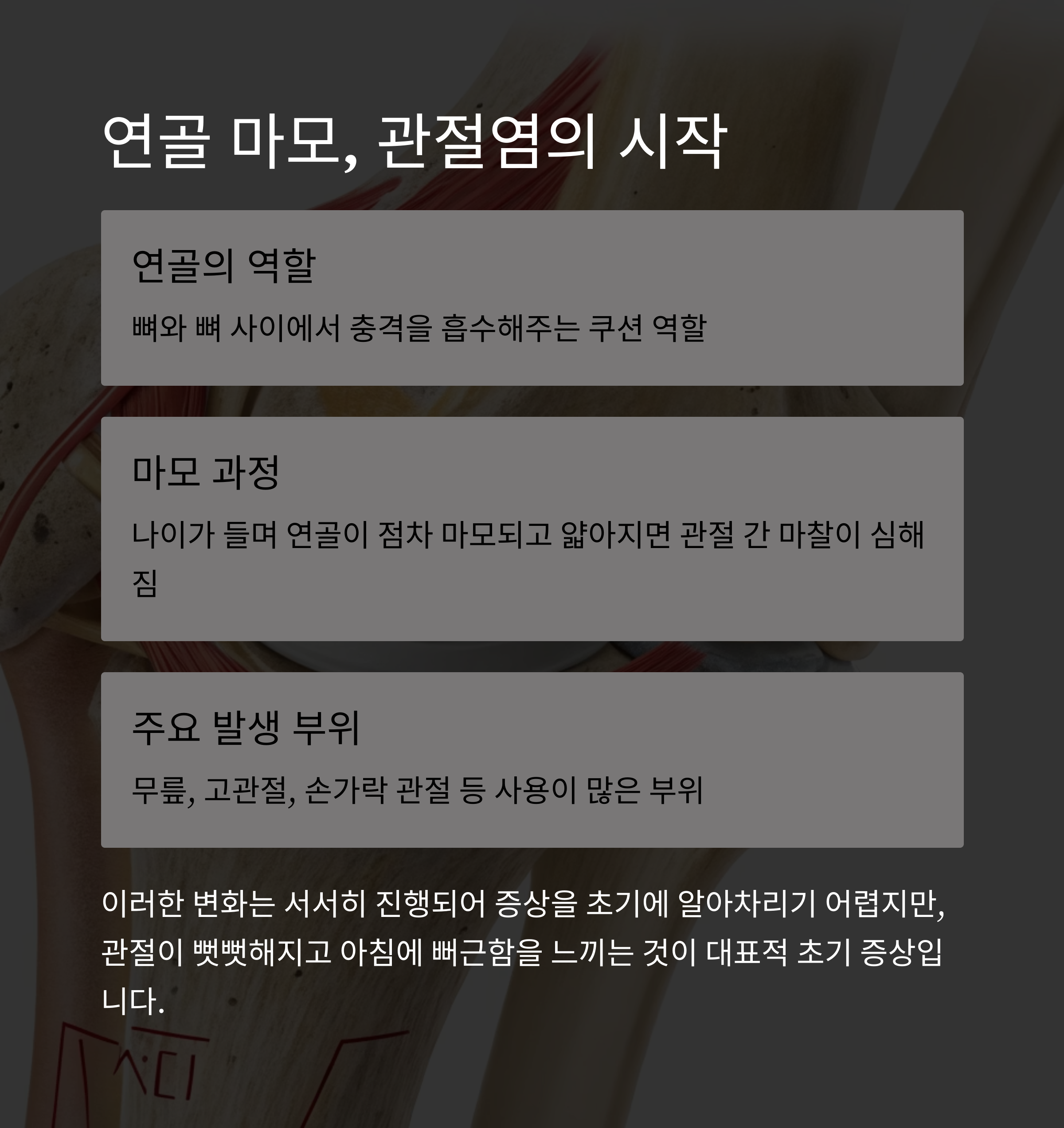 하지만 나이가 들며 연골이 점차 마모되고 얇아지면 관절 간 마찰이 심해지고, 이로 인해 통증과 염증이 발생합니다.