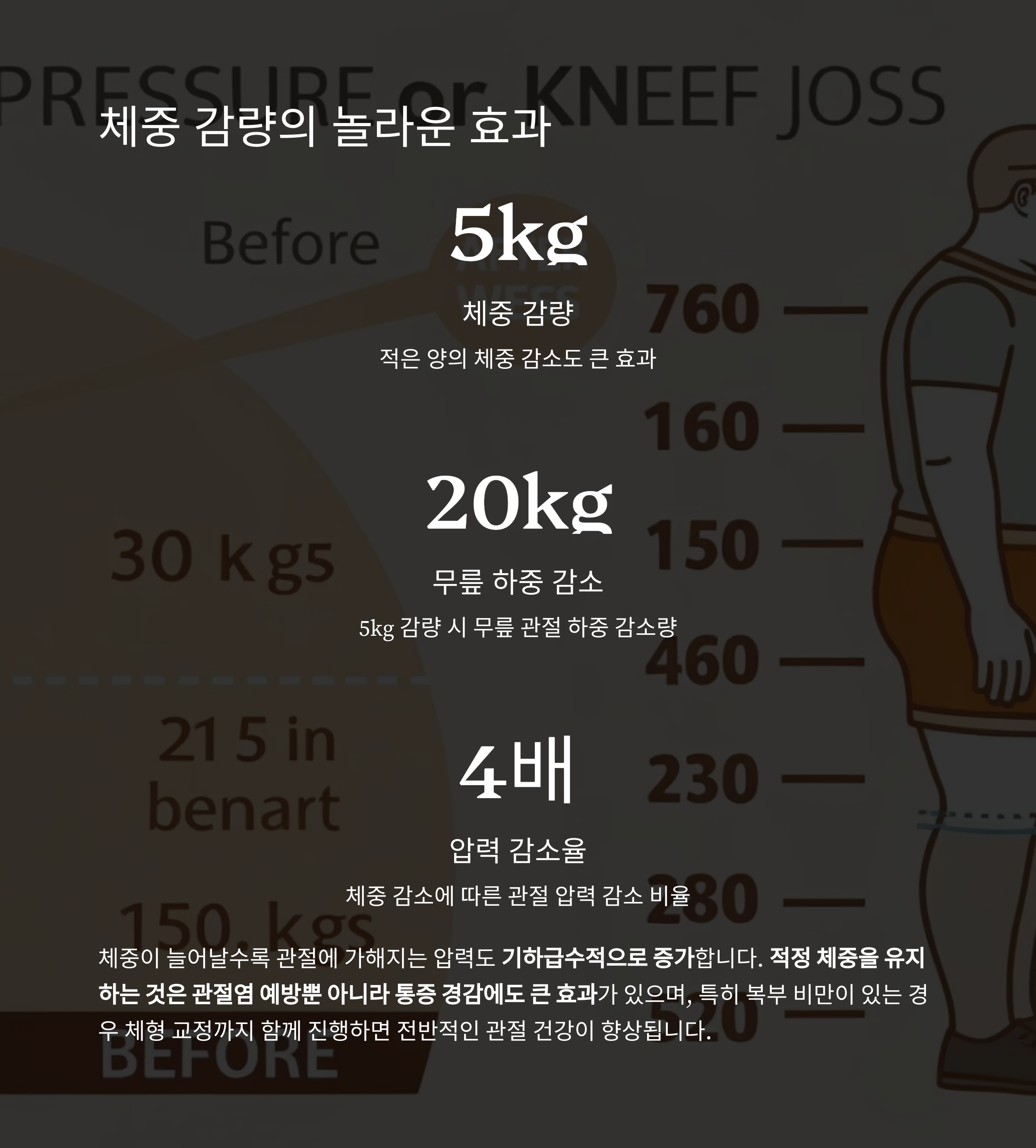 예를 들어, 5kg만 줄여도 무릎 관절에 가해지는 하중은 약 20kg 감소합니다.