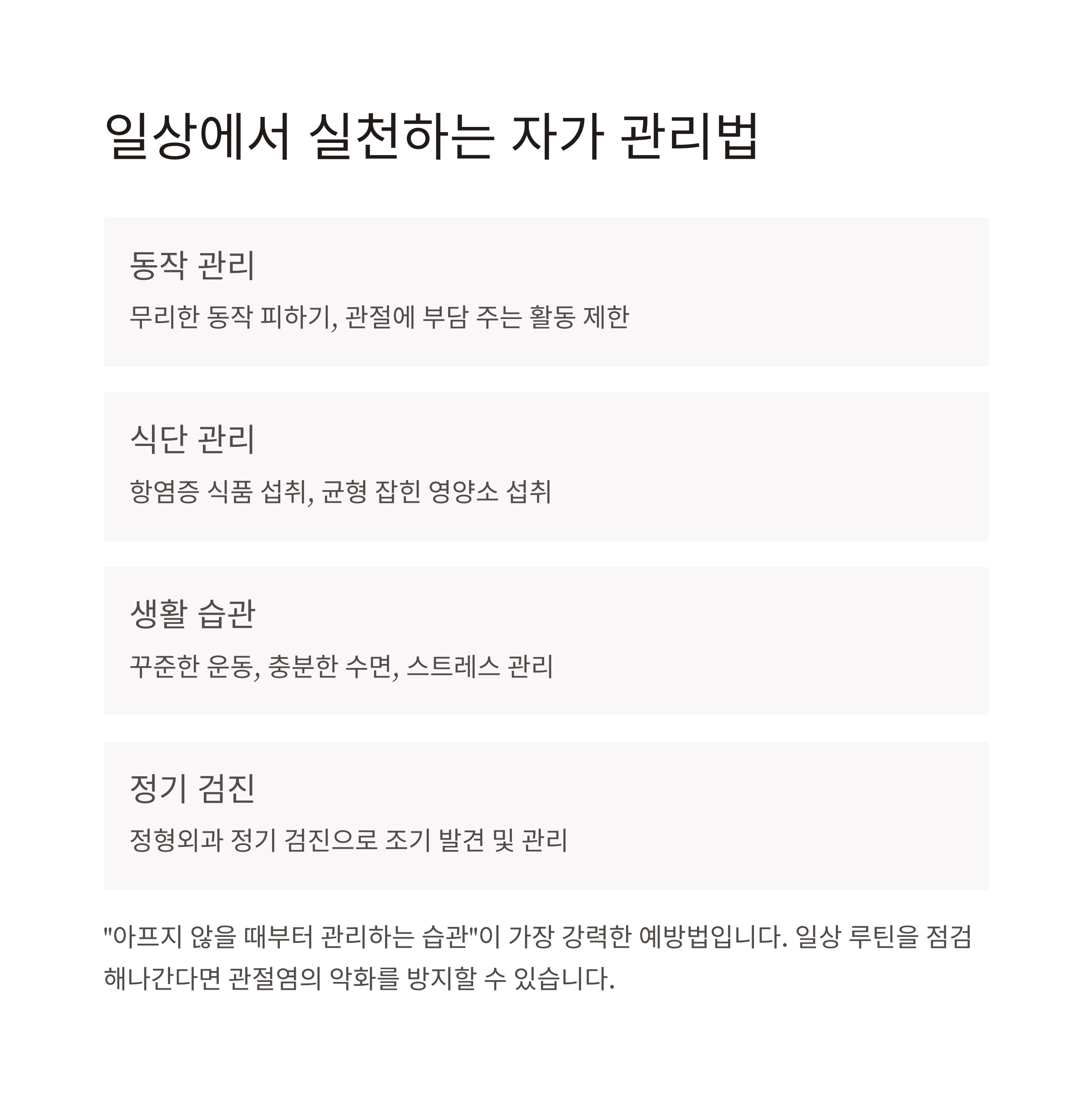 무리한 동작 피하기, 균형 잡힌 식단, 꾸준한 운동, 충분한 수면 등은 생활 속 실천이 가능한 관리법입니다.