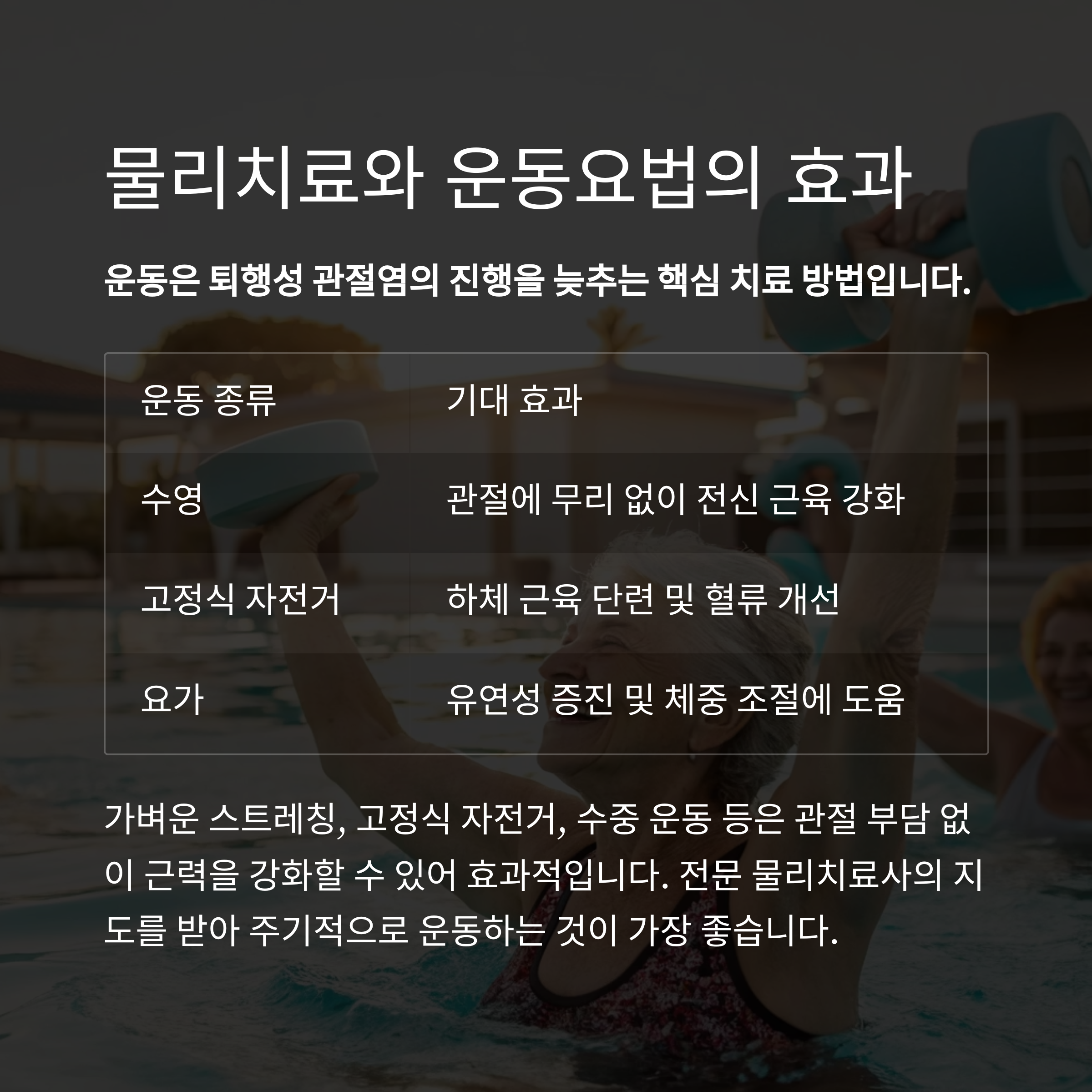 운동은 퇴행성 관절염의 진행을 늦추는 핵심 치료 방법입니다.
