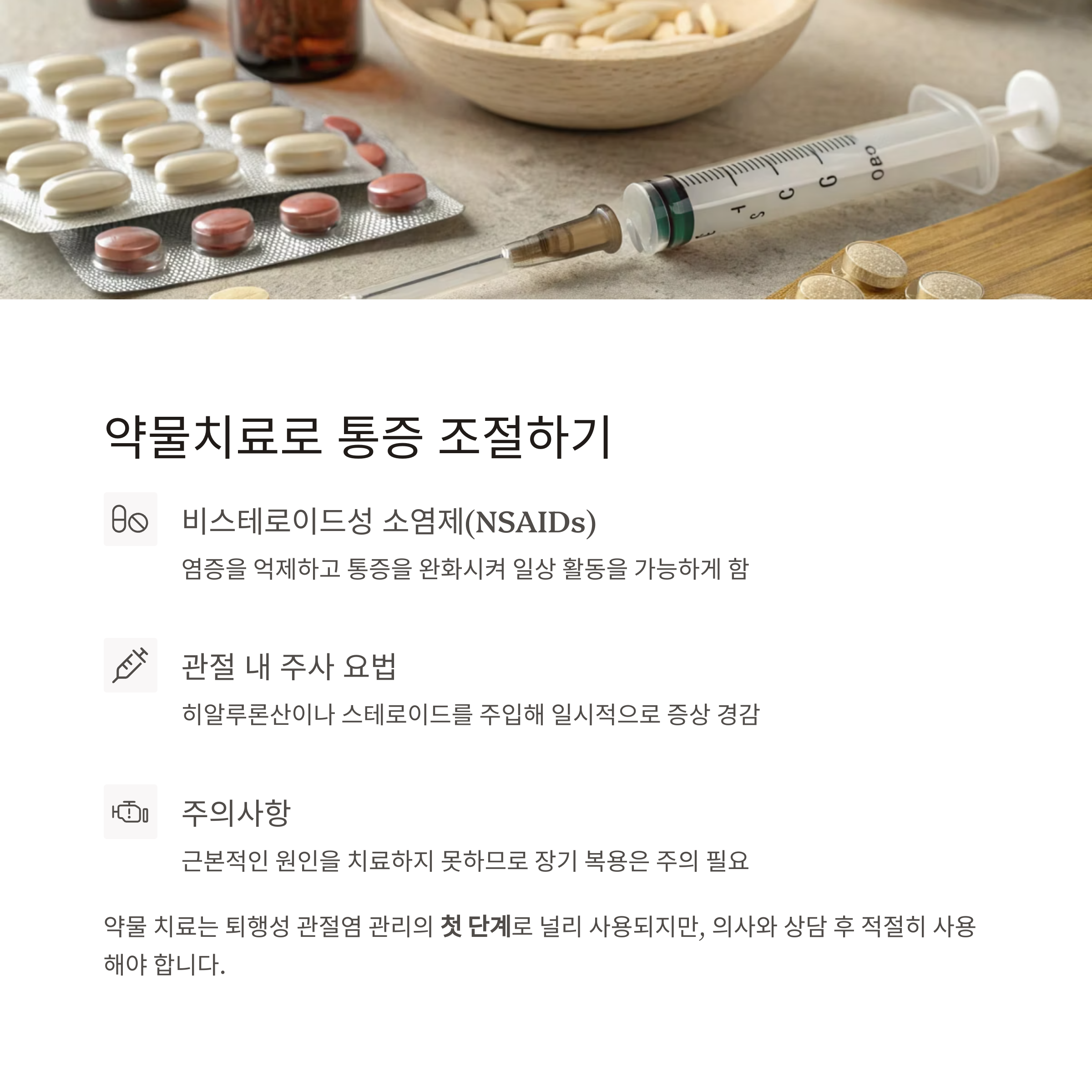 가장 많이 처방되는 약물은 **비스테로이드성 소염제(NSAIDs)**로, 염증을 억제하고 통증을 완화시켜 일상 활동을 가능하게 합니다.