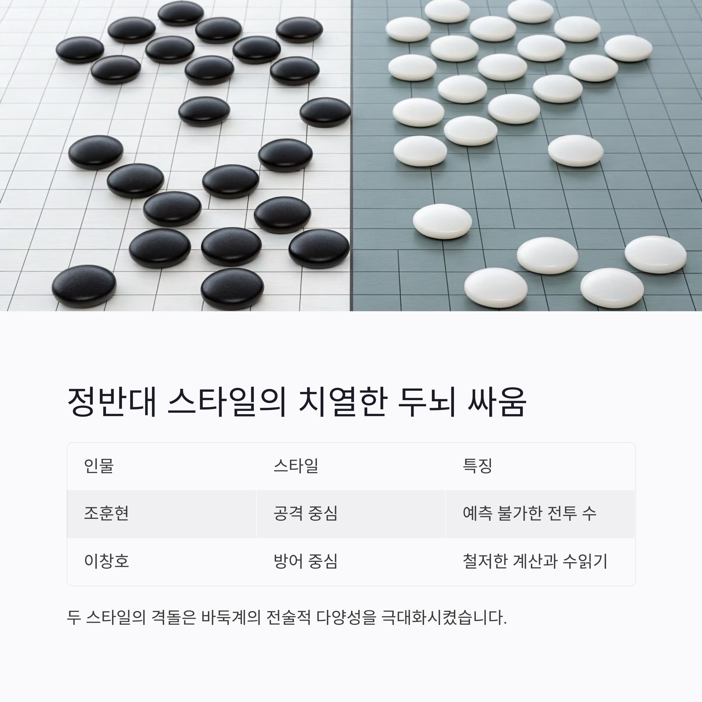 두 스타일의 격돌은 바둑계의 전술적 다양성을 극대화시켰습니다