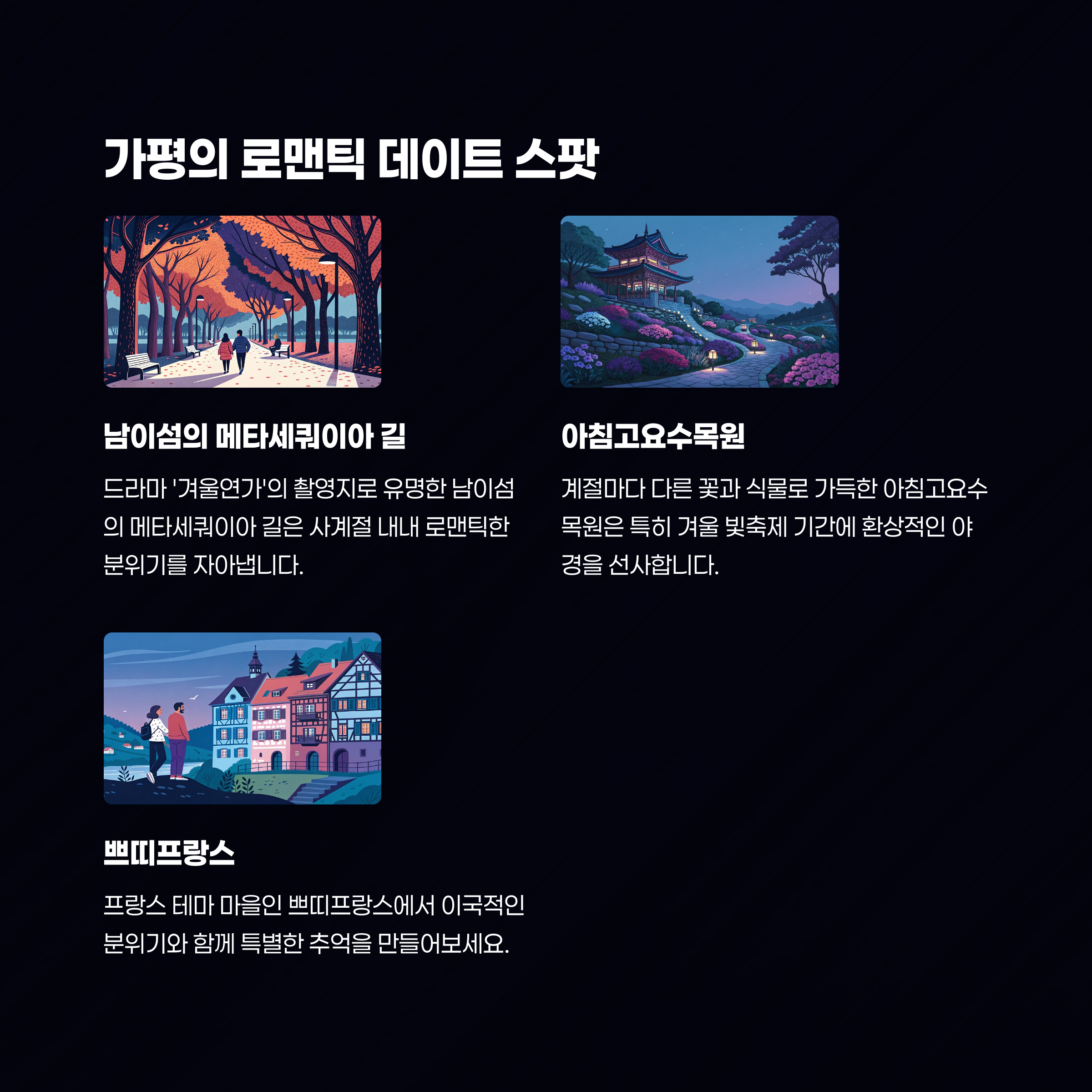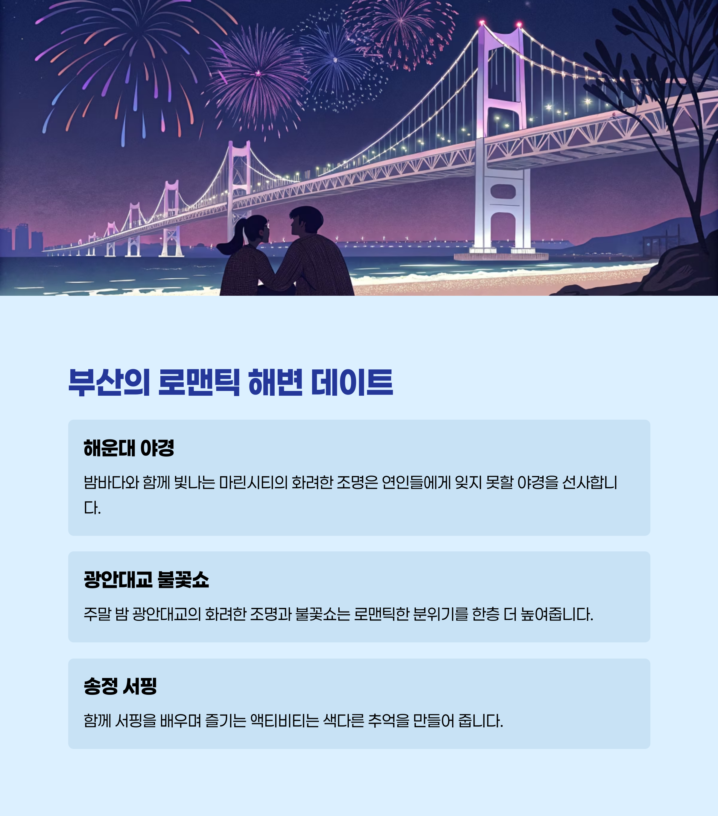 사랑하는 사람과 함께 떠나는 여행은 일상에서 벗어나 서로의 마음을 더욱 가깝게 만들어 주는 소중한 시간입니다. 국내에는 바다의 낭만부터 산과 호수의 평온함, 전통의 정취와 감각적인 도시 풍경까지 커플들에게 완벽한 힐링을 선사할 수 있는 명소들이 곳곳에 자리하고 있습니다. 이 글에서는 제주도, 남해, 경주, 부산, 속초, 강릉, 가평 등 일곱 곳의 대표적인 감성 여행지를 엄선하여 소개합니다. 각 지역마다 색이 다른 매력과 로맨틱 포인트를 지니고 있어, 두 사람만의 특별한 추억을 쌓기에 더없이 완벽한 선택이 될 것입니다.