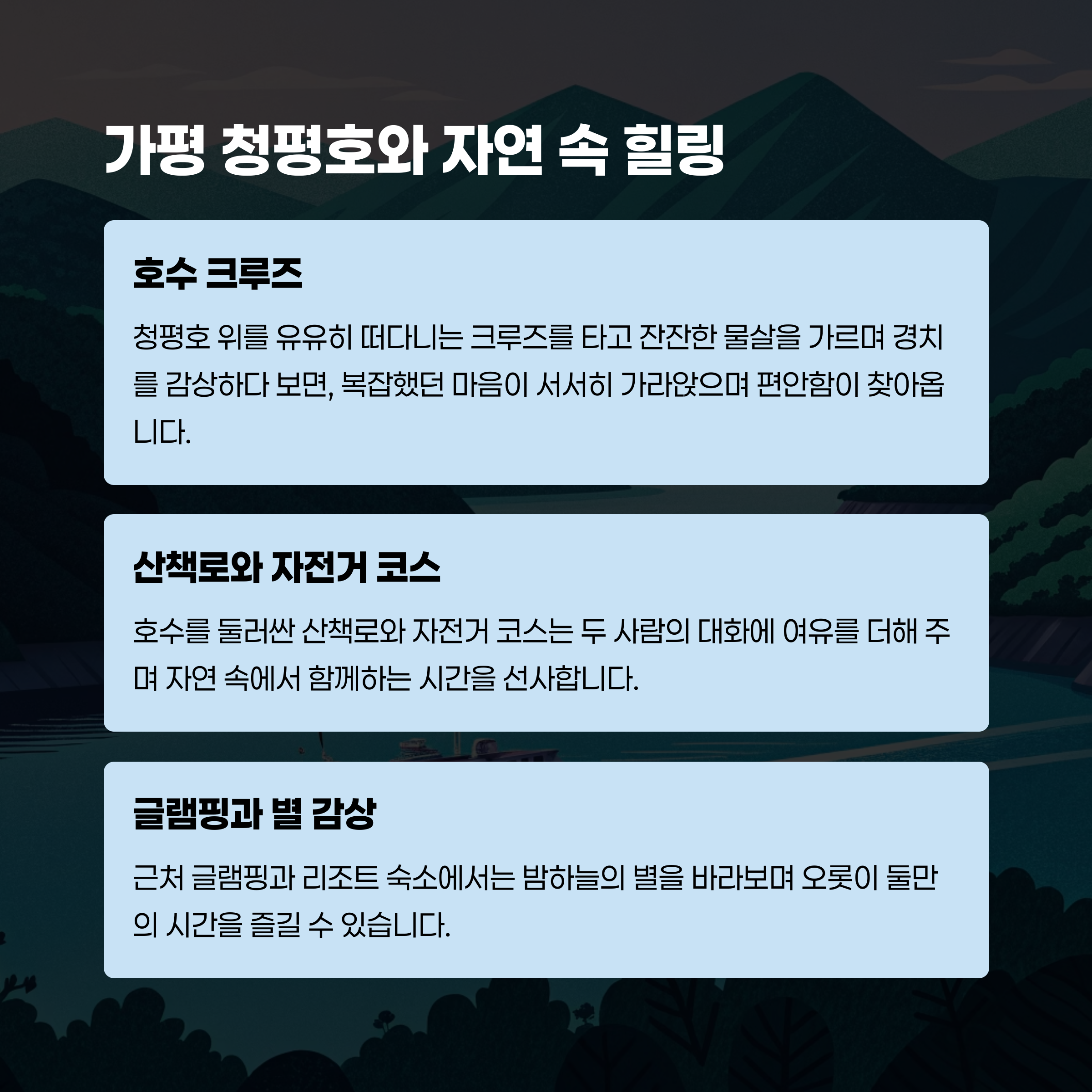 서울에서 한 시간 남짓, 가평 청평호는 맑은 호수와 숲이 어우러진 자연 속 쉼터입니다. 크루즈를 타고 유유히 떠다니며 풍경을 감상하거나, 산책로와 자전거 길에서 대화를 나누는 순간이 특별함을 더해 줍니다. 밤에는 글램핑장에서 별을 보며 조용히 시간을 보내며, 서로의 존재를 더욱 깊이 느낄 수 있습니다.