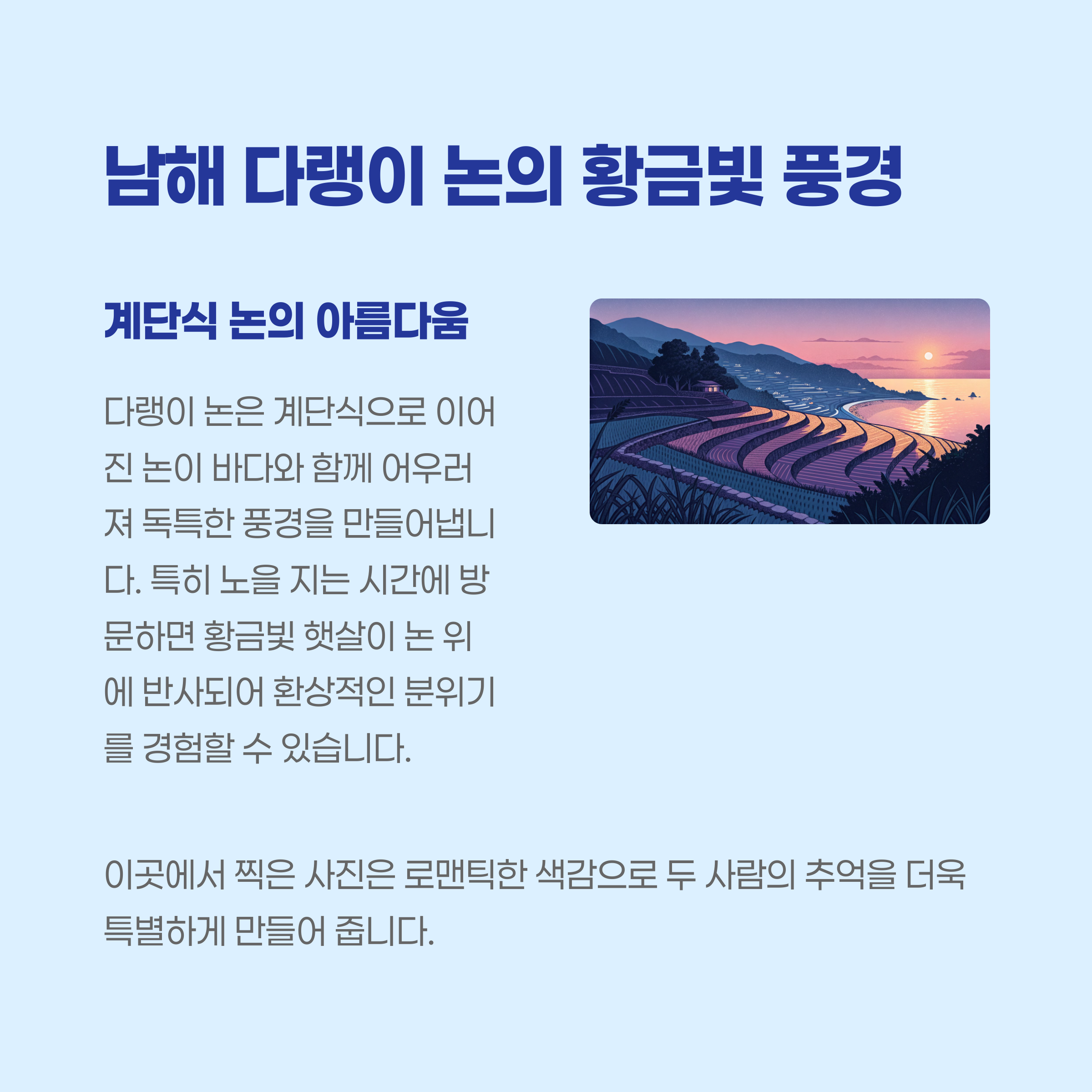 조용한 바닷가 언덕에 자리한 남해 독일마을은 유럽의 분위기를 그대로 간직한 감성 여행지입니다. 붉은 지붕과 흰 벽으로 이루어진 골목은 두 사람만의 동화 같은 추억을 만들어 줍니다. 반면 다랭이 논에서는 계단식 논이 바다와 어우러진 풍경을 감상할 수 있으며, 특히 해질 무렵의 황금빛 장면은 커플 사진에 로맨틱한 색채를 더해 줍니다.