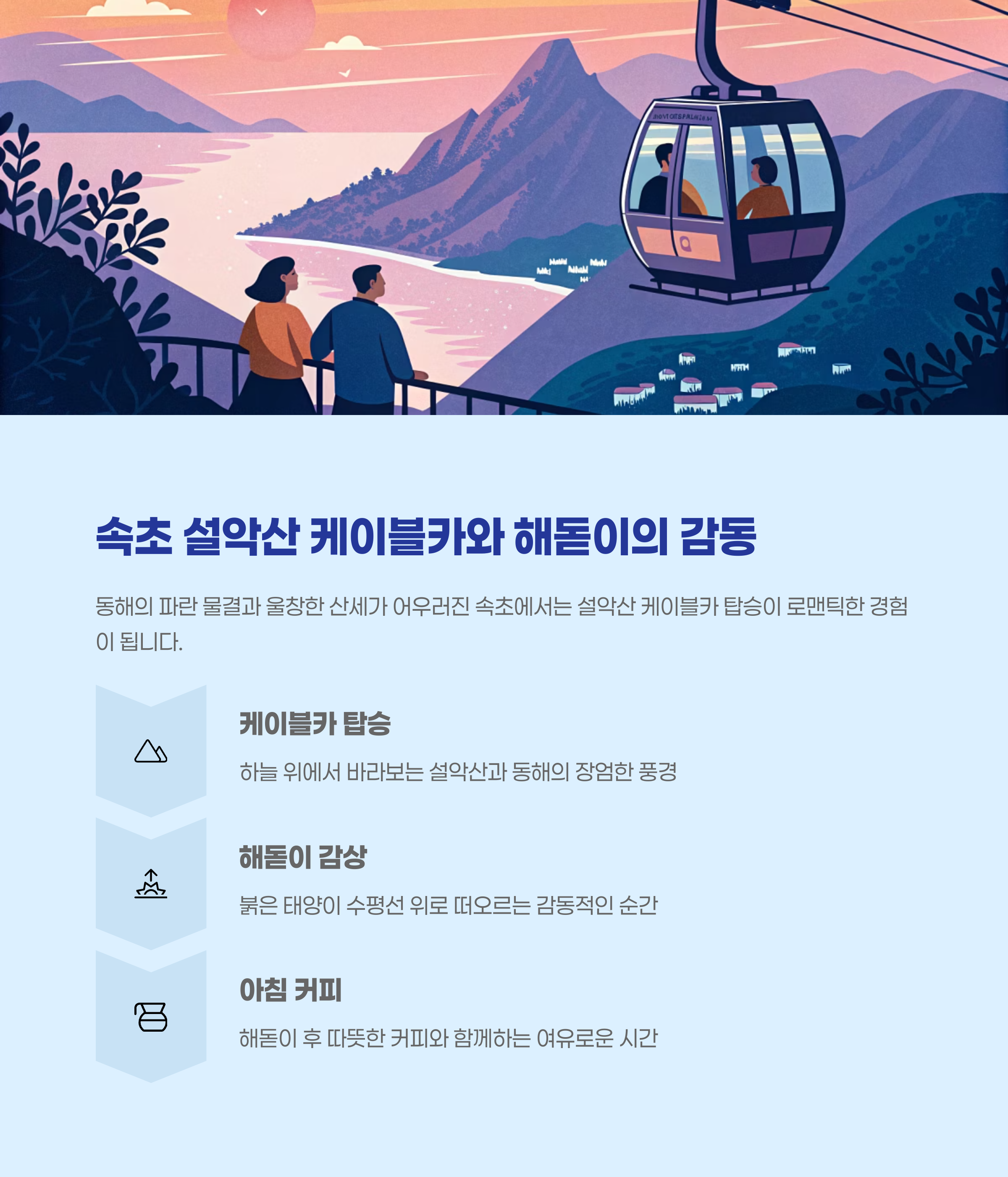울창한 산과 동해 바다가 어우러진 속초에서의 설악산 케이블카는 특별한 경험을 선사합니다. 높은 곳에서 바라보는 탁 트인 풍경은 마치 세상에서 단둘만 존재하는 듯한 착각을 줍니다. 특히 일출 시간대의 붉게 타오르는 태양은 두 사람의 새로운 하루를 잊지 못할 추억으로 남겨 줍니다.