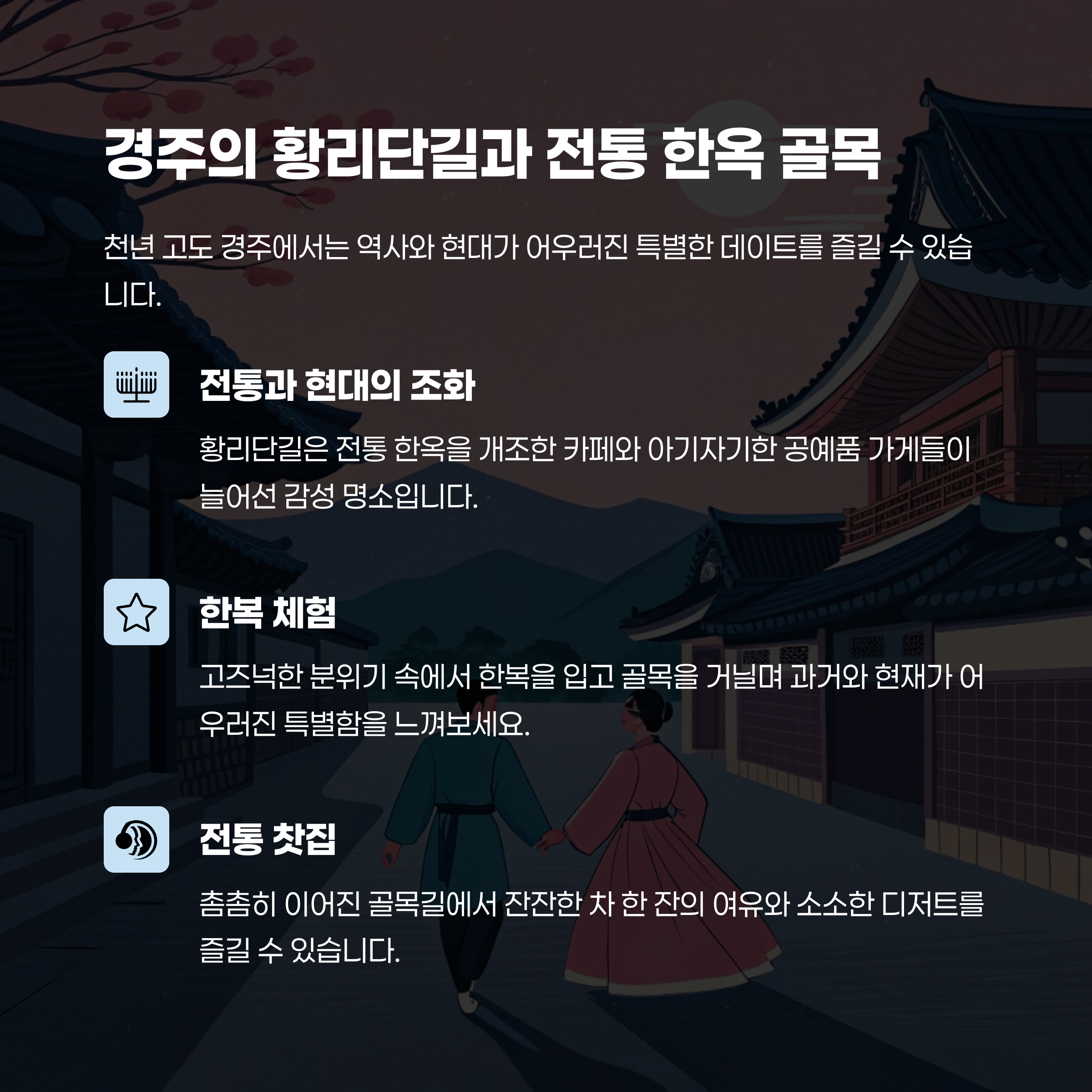 전통과 현대가 어우러진 경주 황리단길은 한옥을 개조한 카페와 공방들이 줄지어 있는 감성 거리입니다. 고즈넉한 기와 지붕 아래를 한복을 입고 걷는 그 순간, 시간의 흐름을 거스르는 듯한 특별한 기분을 느낄 수 있습니다. 커피 한 잔의 여유와 아기자기한 디저트 맛집에서 나누는 대화는 둘 사이의 공감을 더 깊게 만들어 줍니다.