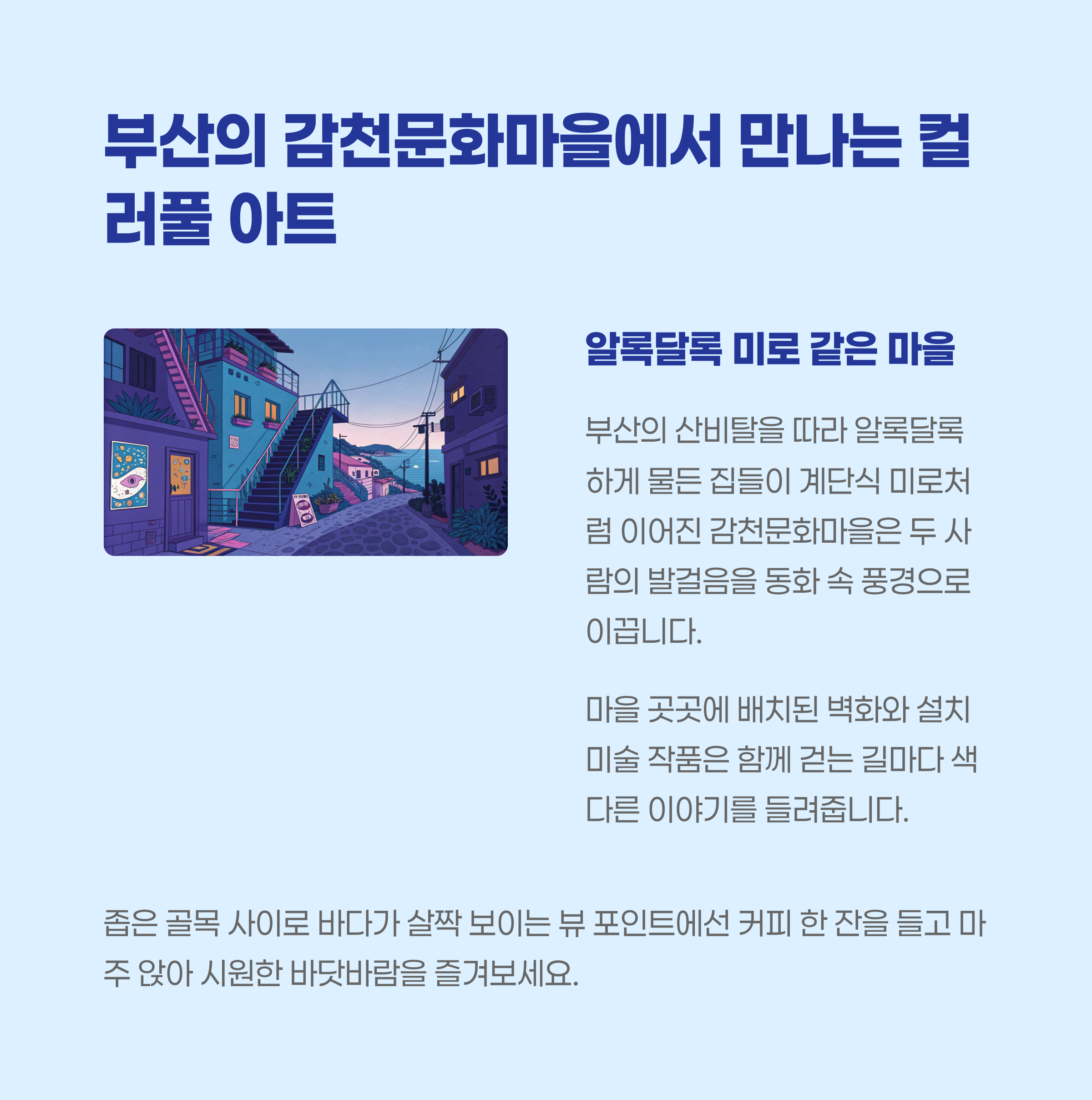 형형색색의 집들이 언덕을 따라 펼쳐진 감천문화마을은 예술과 감성의 거리입니다. 계단식 골목을 따라 걸으며 벽화와 조형물을 감상하는 시간은 마치 동화 속을 걷는 듯한 기분을 선사합니다. 골목 사이로 바다가 살짝 보이는 뷰 포인트에서 커피를 마시며 나누는 대화는 오직 두 사람만의 여유로움을 만들어 줍니다.