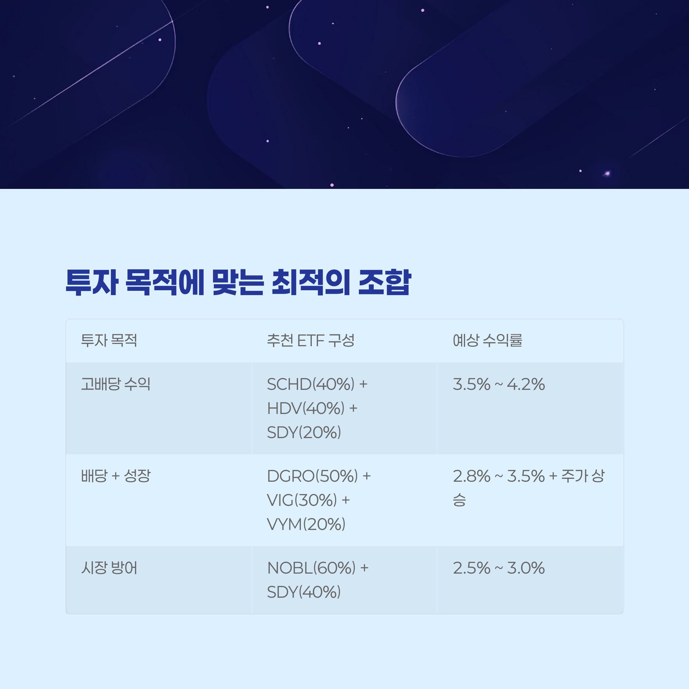 | 시장 방어 | NOBL(60%) + SDY(40%) | 2.5% ~ 3.0% |