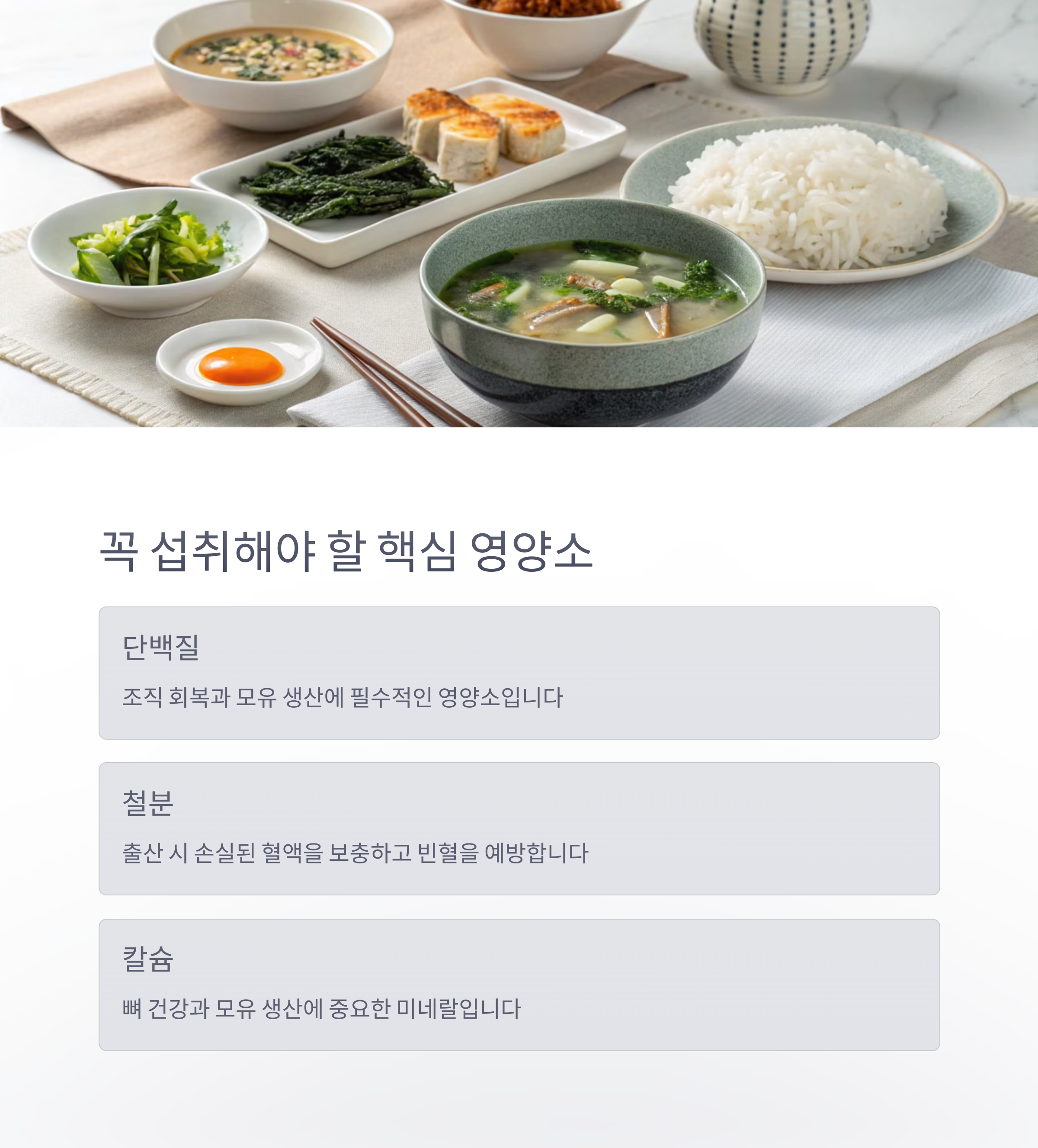 산후 건강 회복을 위한 식단 가이드: 핵심 영양소와 피해야 할 음식 정리