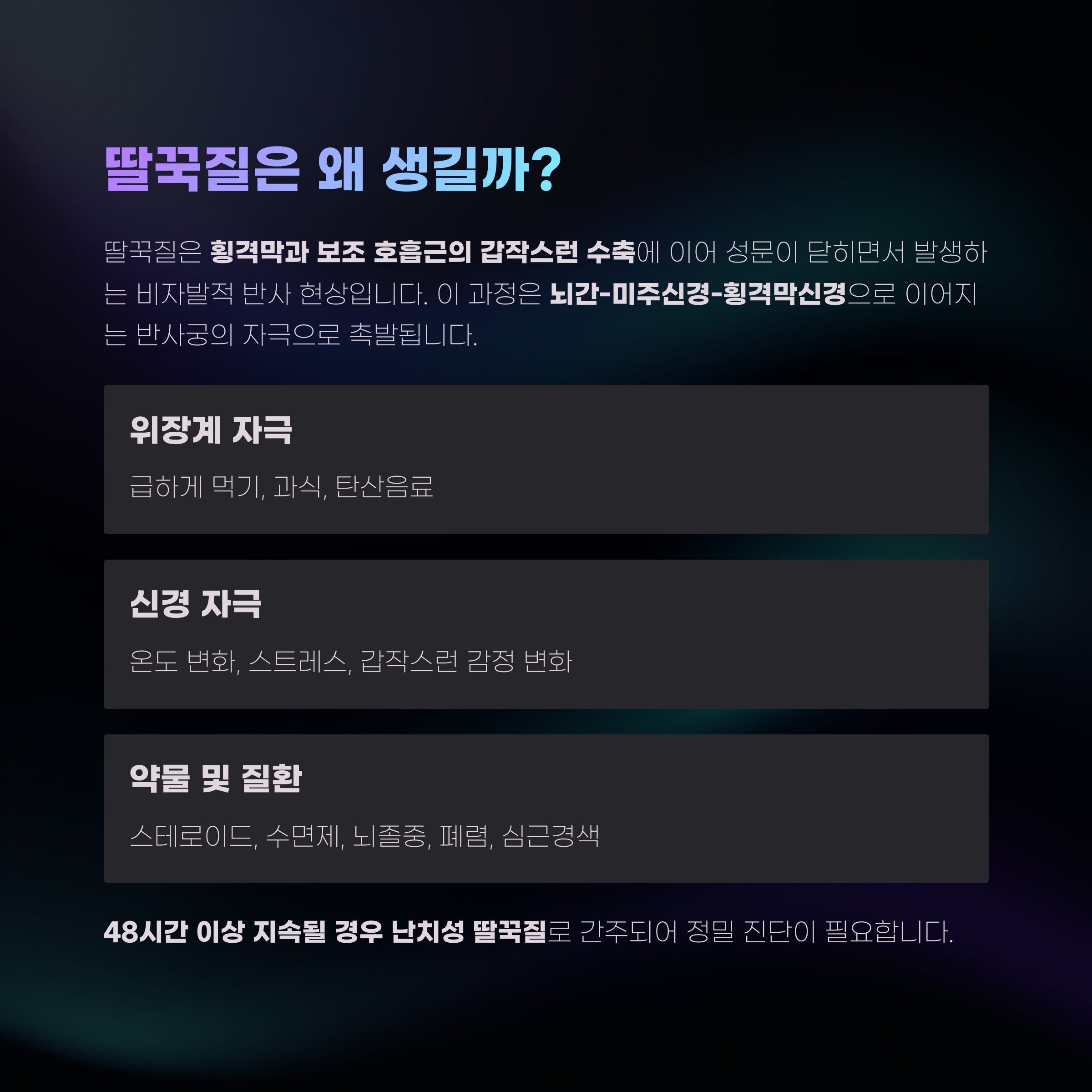 48시간 이상 지속될 경우 난치성 딸꾹질로 간주되어 정밀 진단이 필요합니다