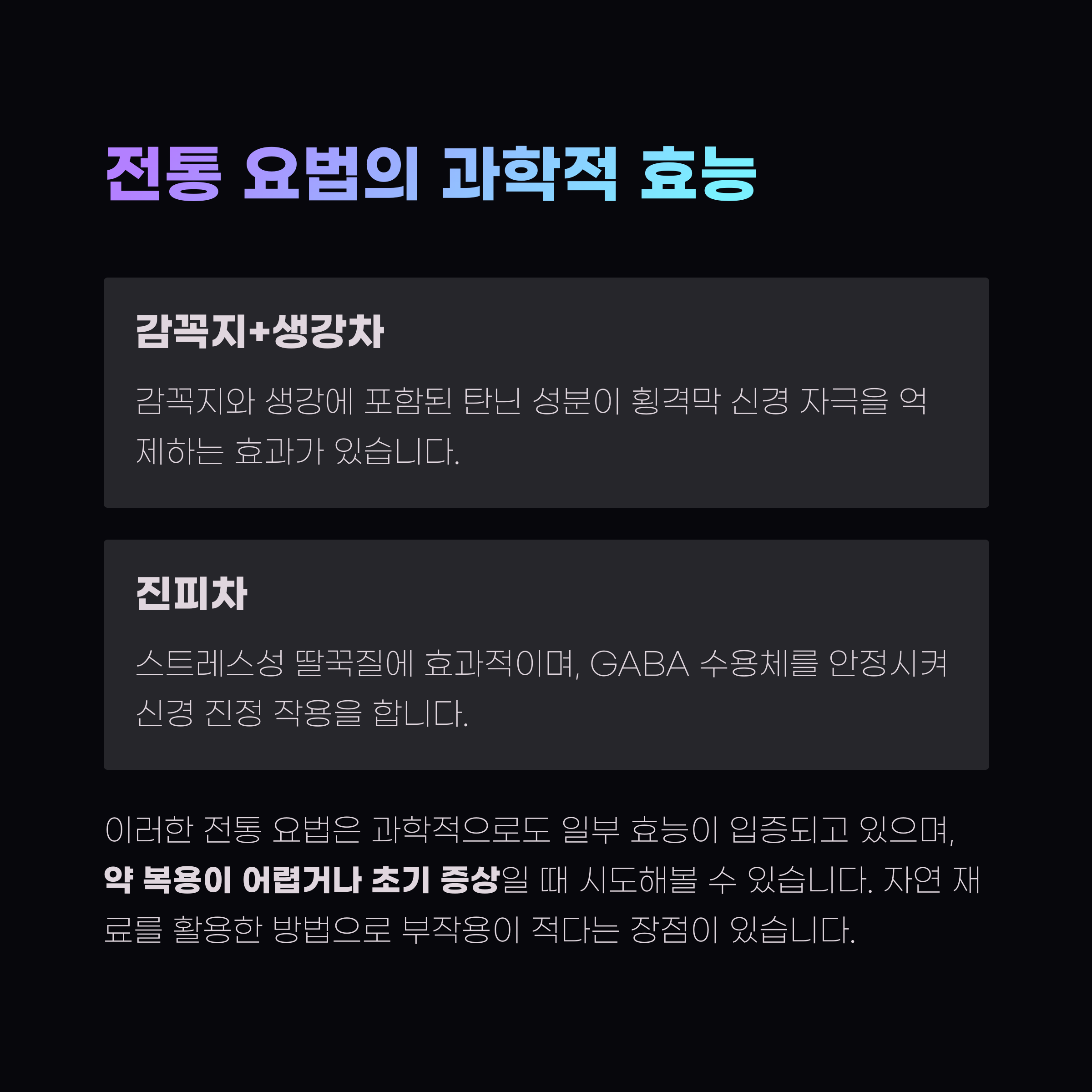 - 감꼭지+생강차: 횡격막 신경 자극 억제 (탄닌 작용)