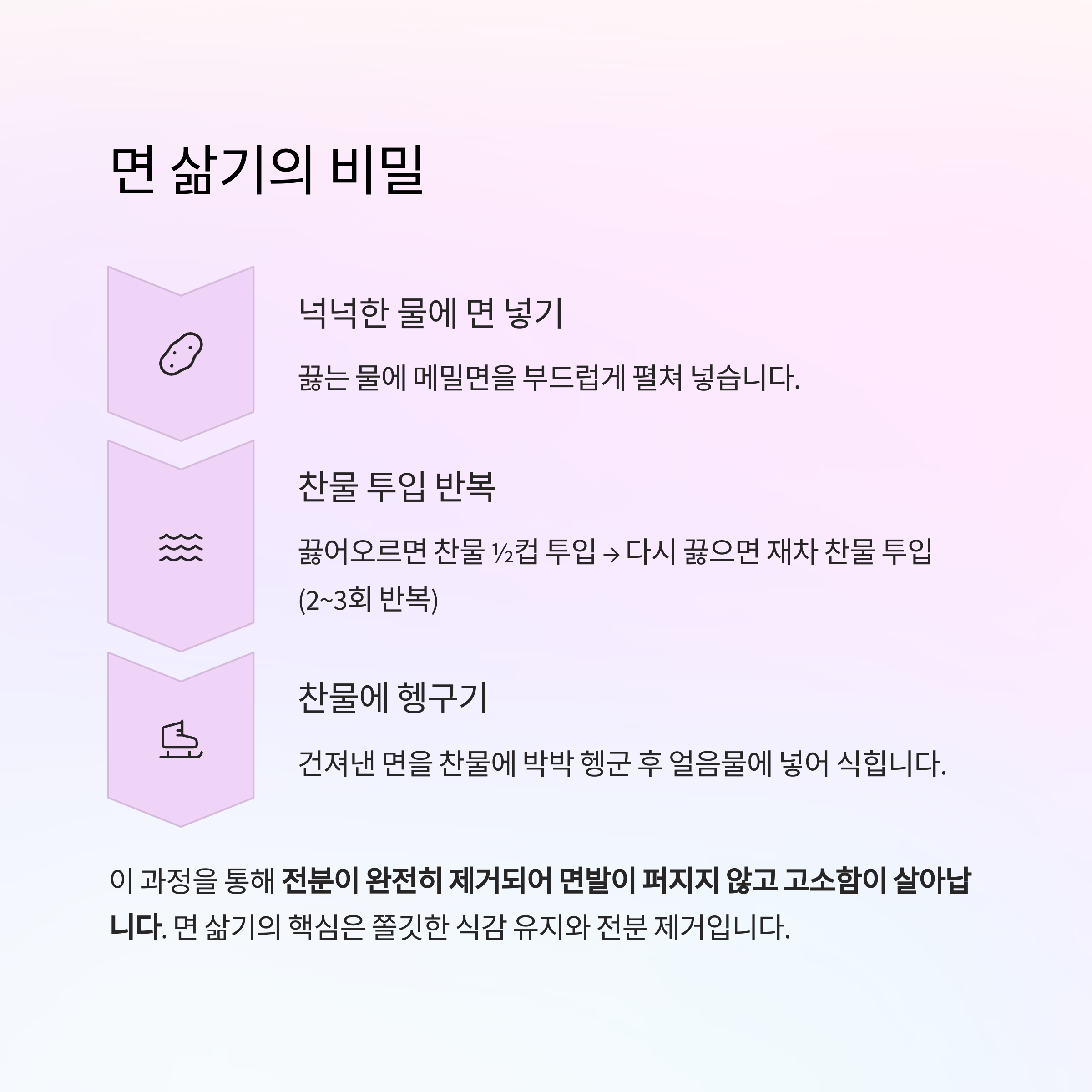 이 과정을 통해 면이 퍼지지 않고 쫄깃함을 유지합니다. - 삶은 면은 찬물에 여러 번 헹궈 전분기를 제거한 뒤
