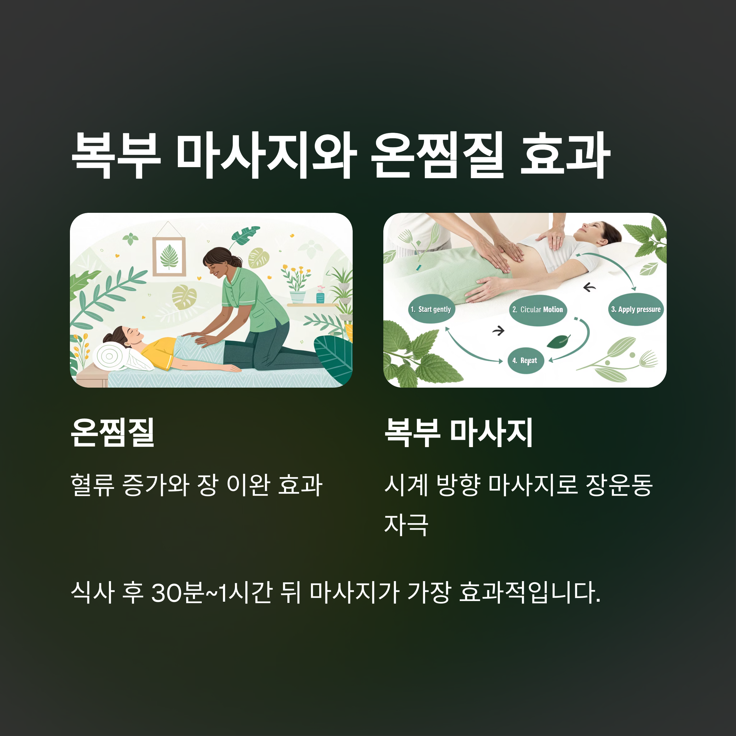 | 온찜질 | 혈류 증가, 장 이완 |