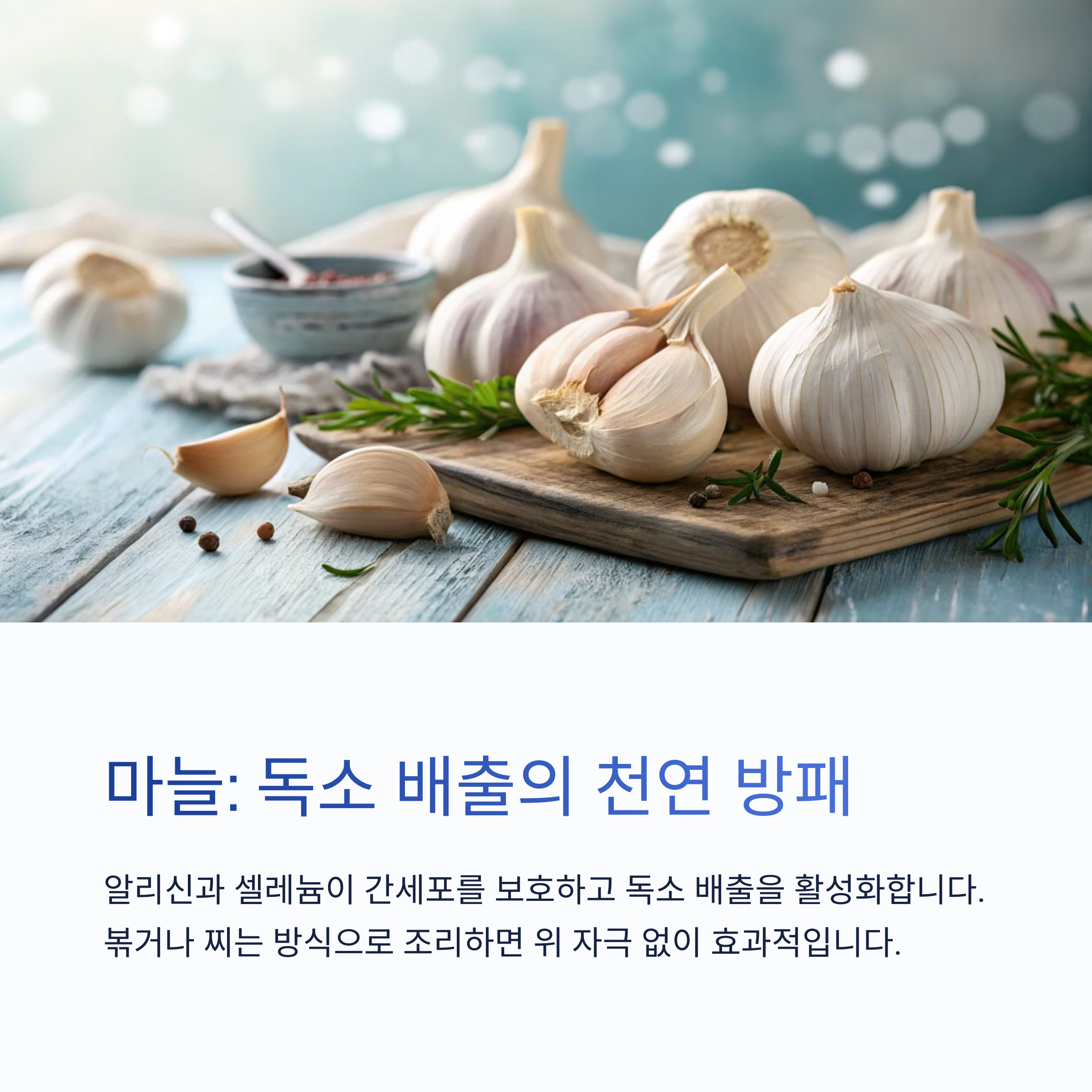 | 마늘 | 독소 배출, 간세포 보호 | 익혀서 요리에 첨가 |