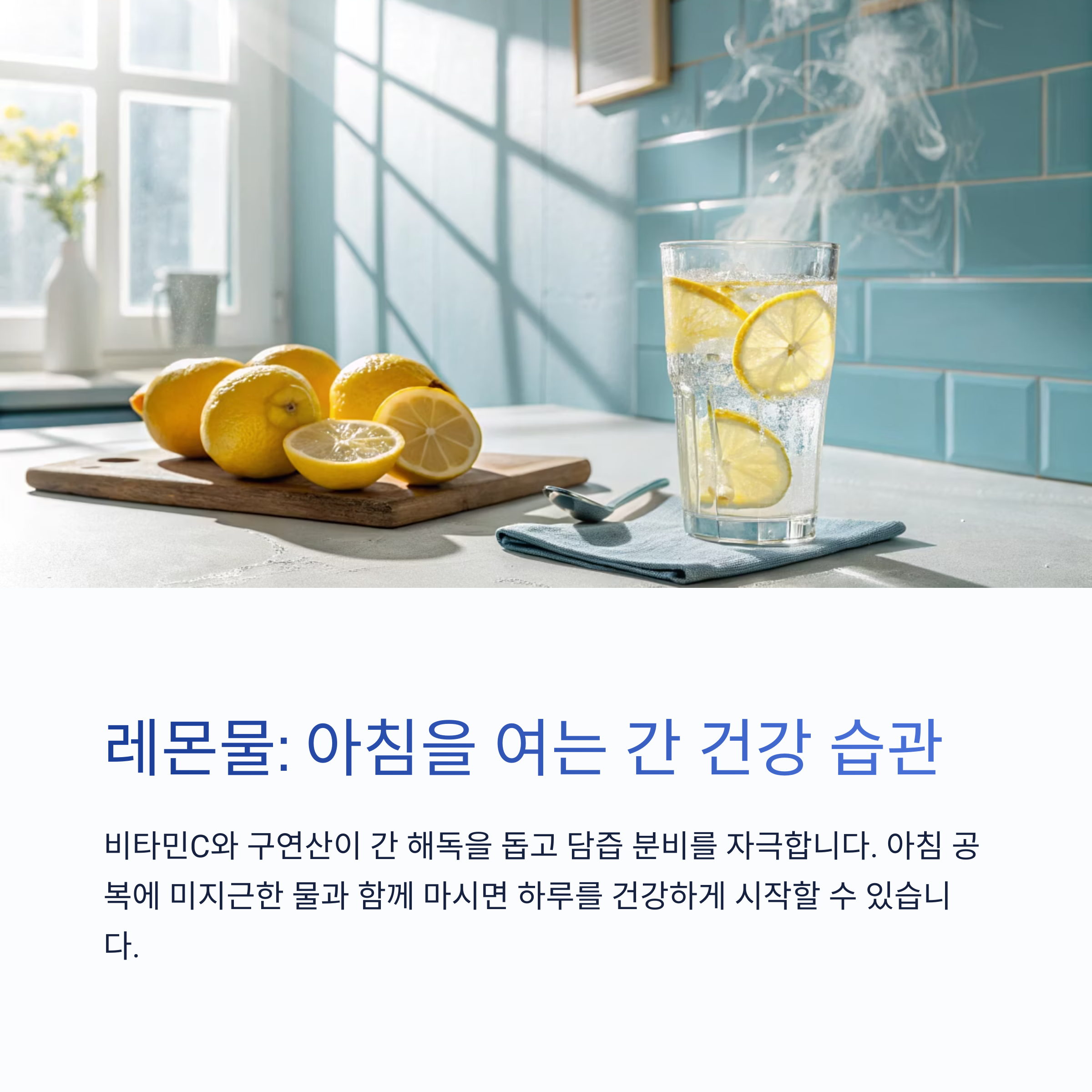 | 레몬물 | 담즙 분비, 해독 촉진 | 아침 공복에 미지근한 물과 함께 |