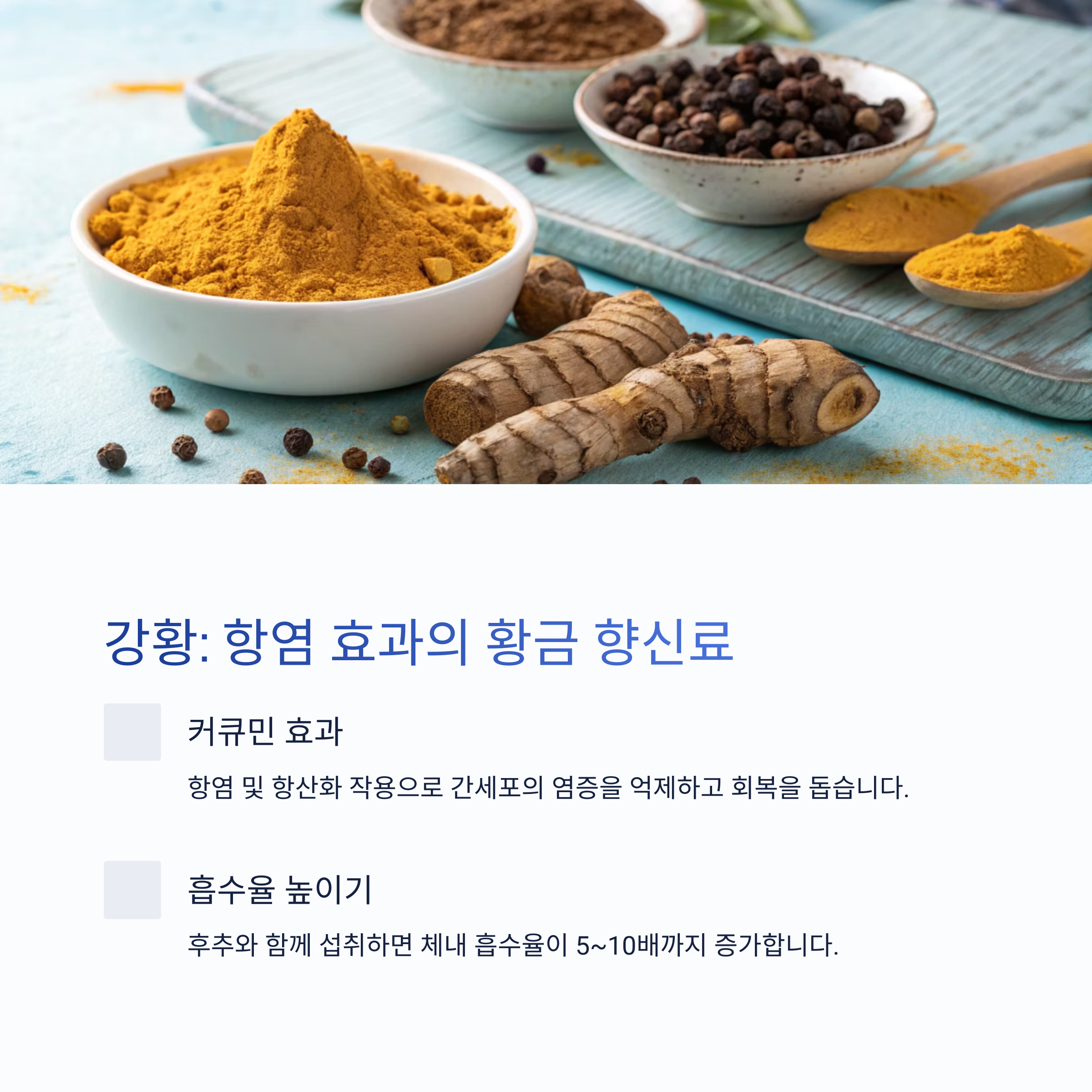 | 강황 | 항염·항산화 작용, 간세포 보호 | 후추와 함께 섭취 또는 보충제로 활용 |
