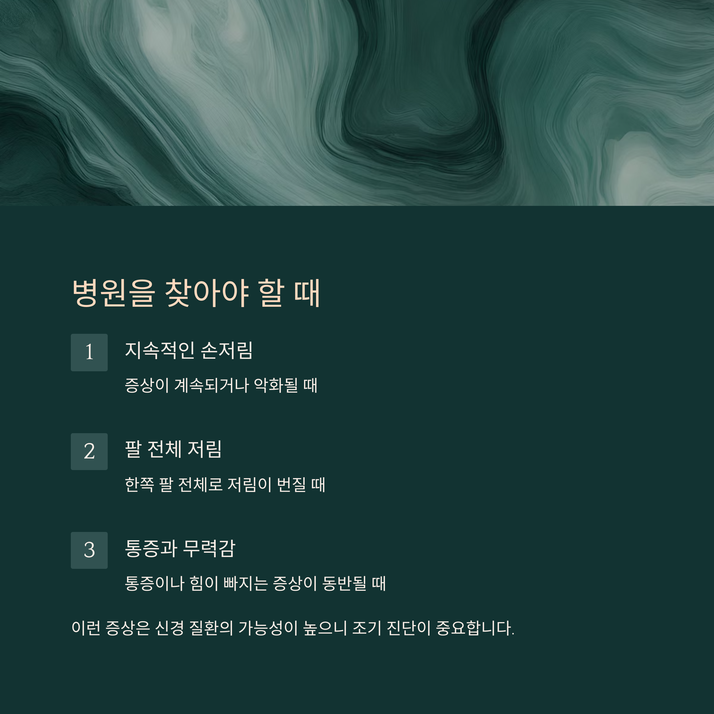 손저림이 지속되거나, 한쪽 팔 전체로 저림이 번지거나