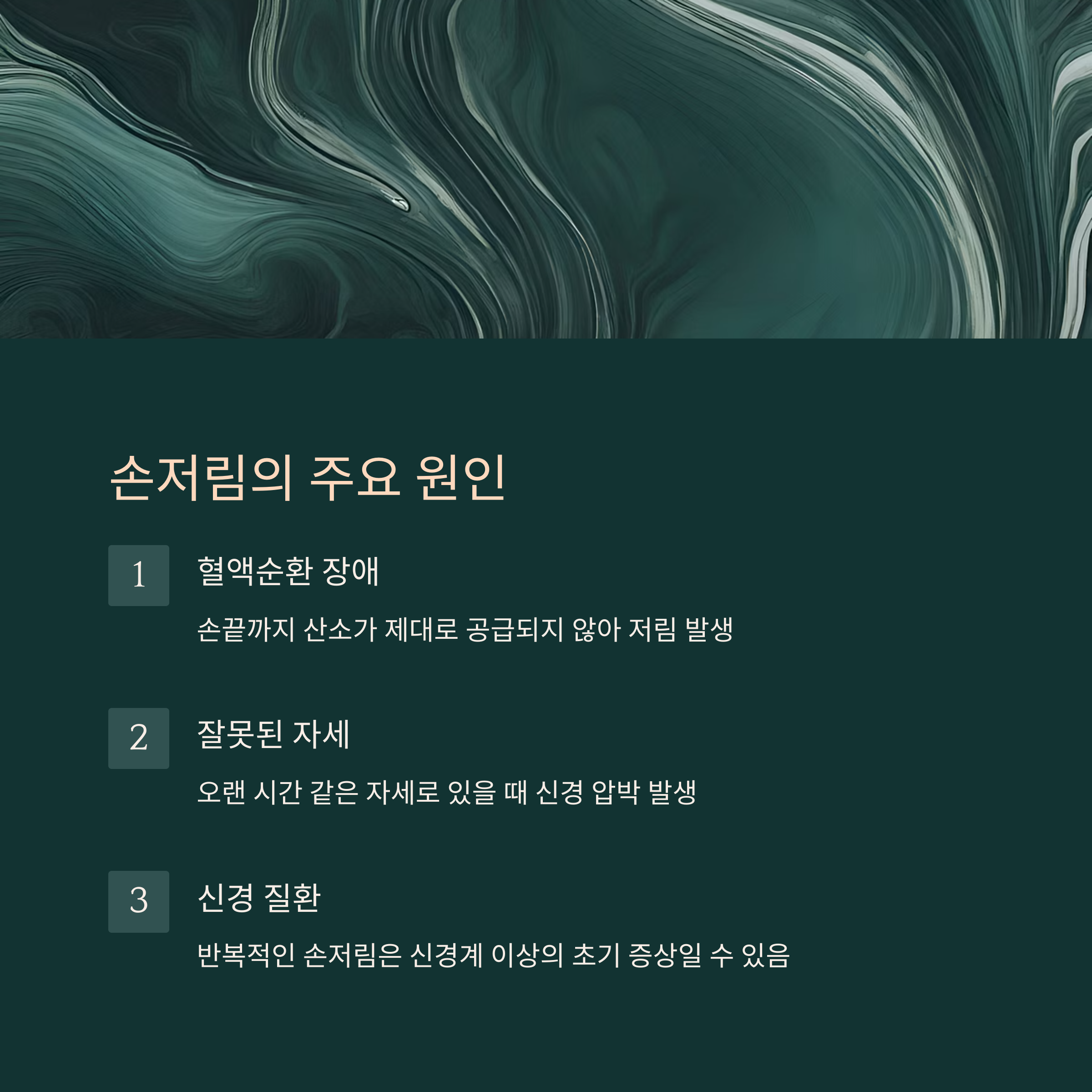 자주 손이 저리는 증상이 반복된다면 단순한 피로나 일시적인 혈액순환 문제일 수도 있지만, 신경계 이상이나 특정 질환과도 관련이 있을 수 있습니다. 본 글에서는 손저림이 오는 대표적인 원인과 관련 질환, 일상생활에서 확인할 수 있는 신호들을 자세히 살펴봅니다. 놓치면 위험할 수 있는 건강 경고 사인을 체크해보세요.