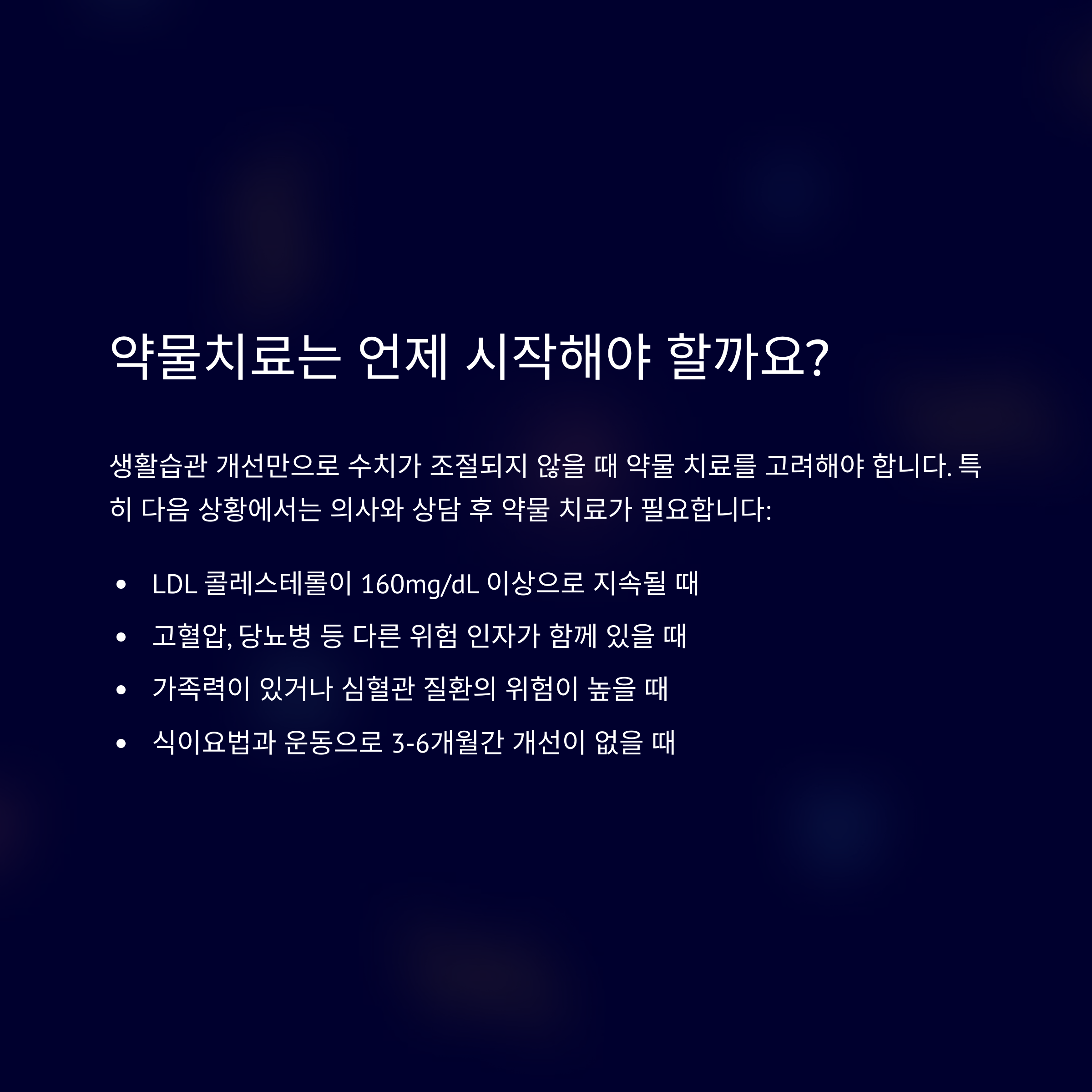 | LDL↑ | 약물 병행 고려, 식이조절 필수 |