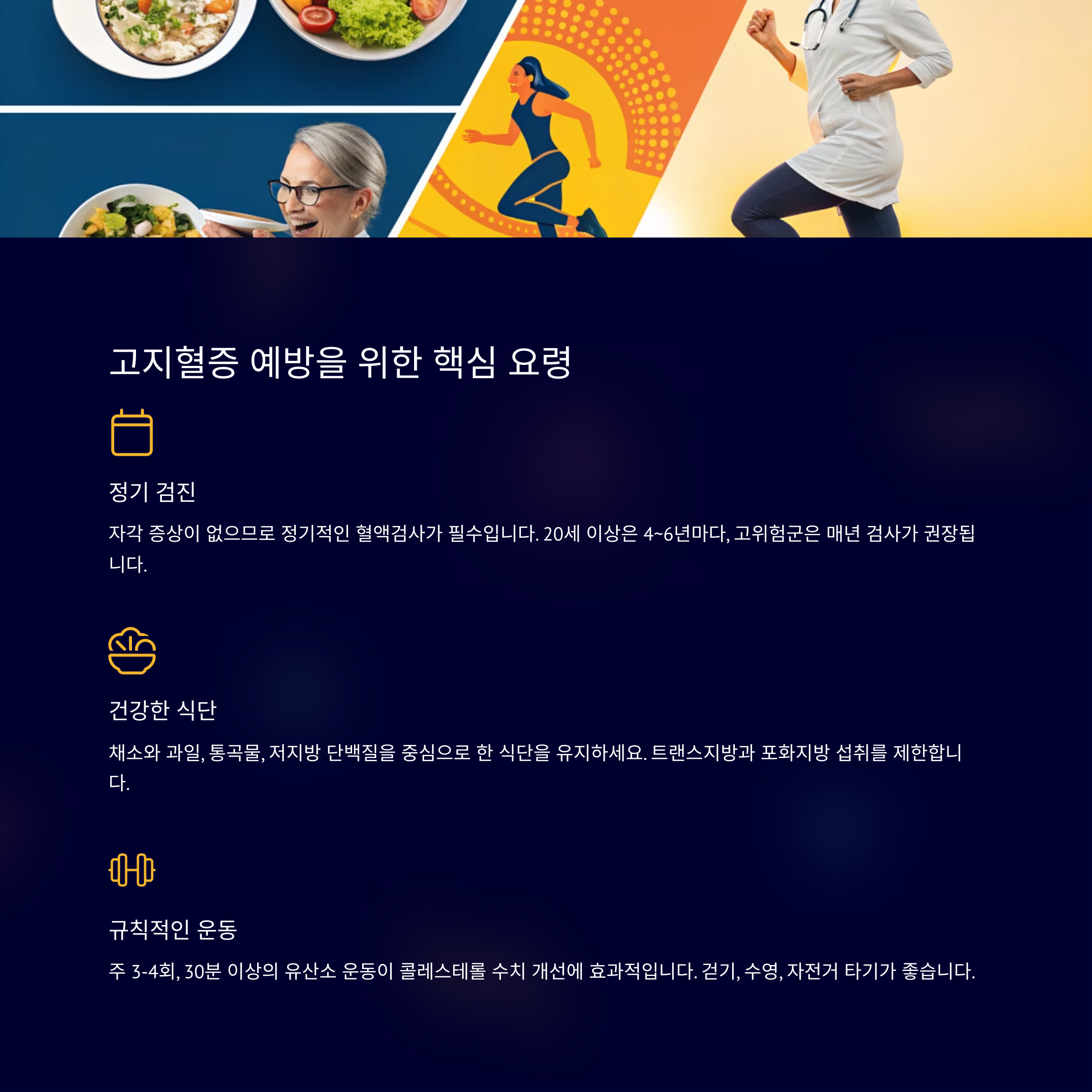 | HDL↓ | 금연, 규칙적 운동, 오메가-3 섭취 |