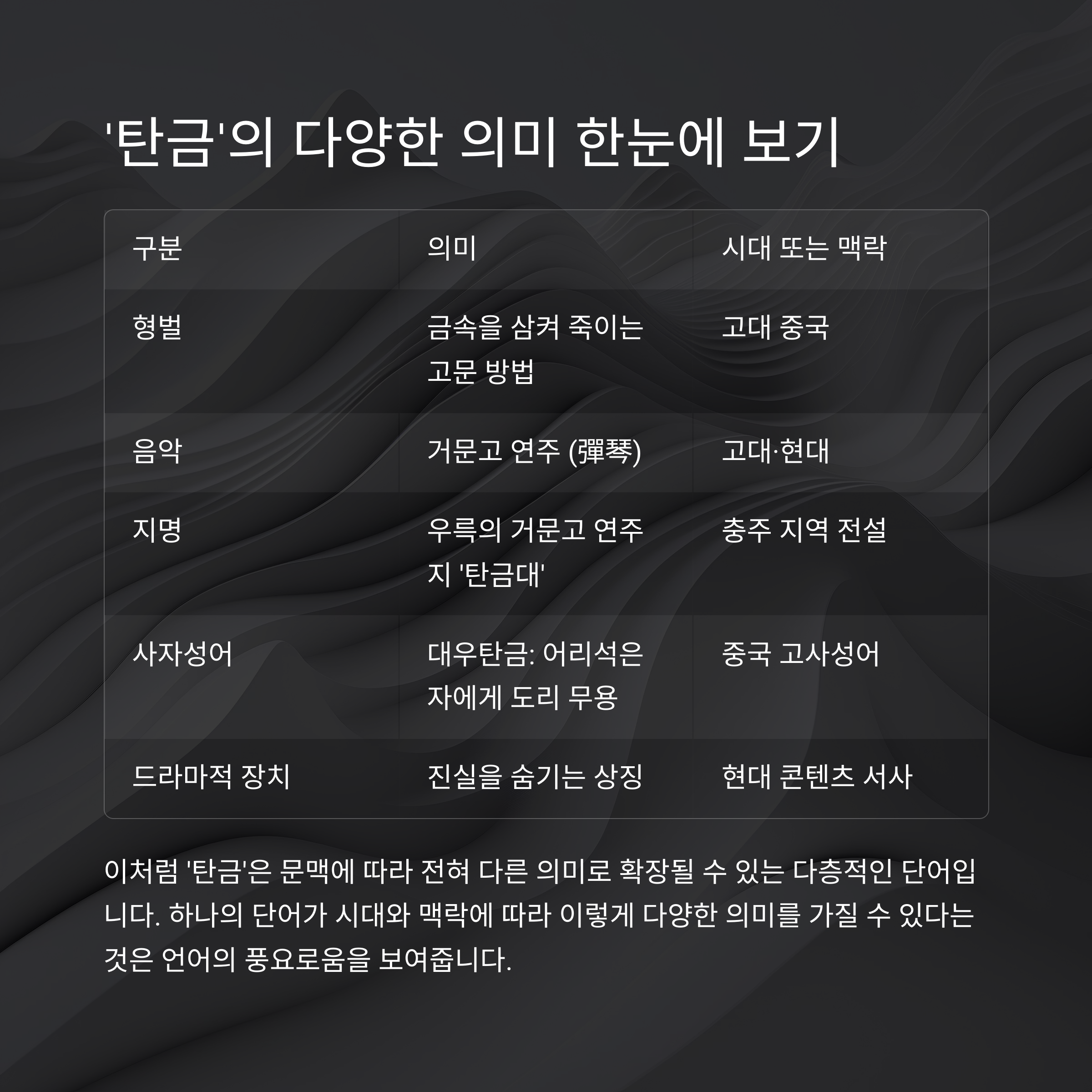 '탄금'이라는 단어는 단순히 발음상 아름다운 말처럼 들리지만, 실제로는 역사·문화·예술·철학이 얽힌 다층적 의미를 지닌 단어입니다. 본문에서는 고대 형벌, 음악적 전통, 사자성어, 그리고 드라마적 상징성까지 다양한 관점에서 '탄금'을 조명합니다. 각각의 맥락은 독립적으로도 흥미롭지만, 전체를 연결할 때 더 큰 상징성과 통찰을 제공합니다.