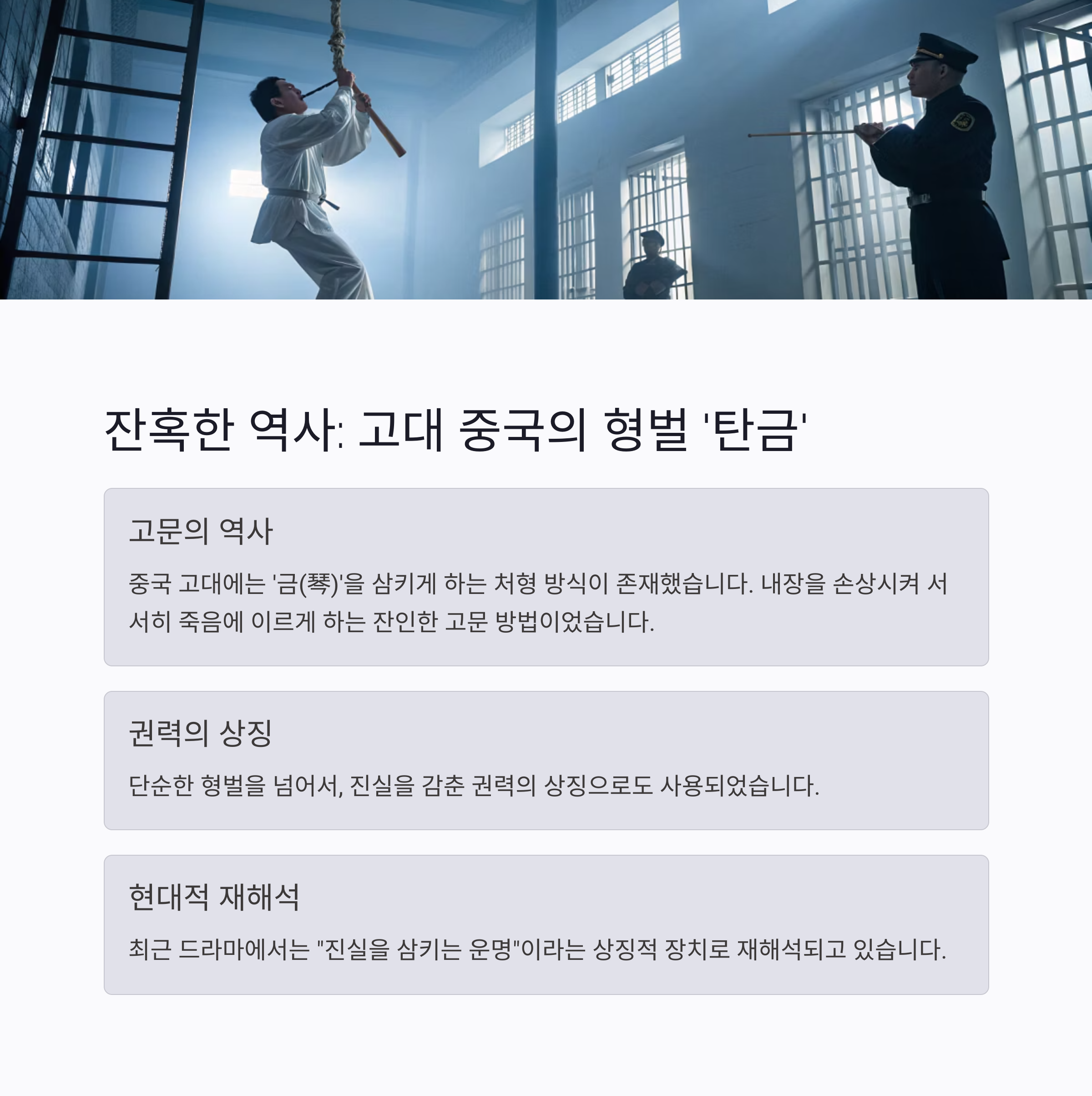 중국 고대에는 '금(琴)'을 삼키게 하는 처형 방식이 있었습니다. 이때의 '탄금(呑琴)'은 내장을 손상시켜 서서히 죽음에 이르게 하는 잔인한 고문 방법이었습니다.
