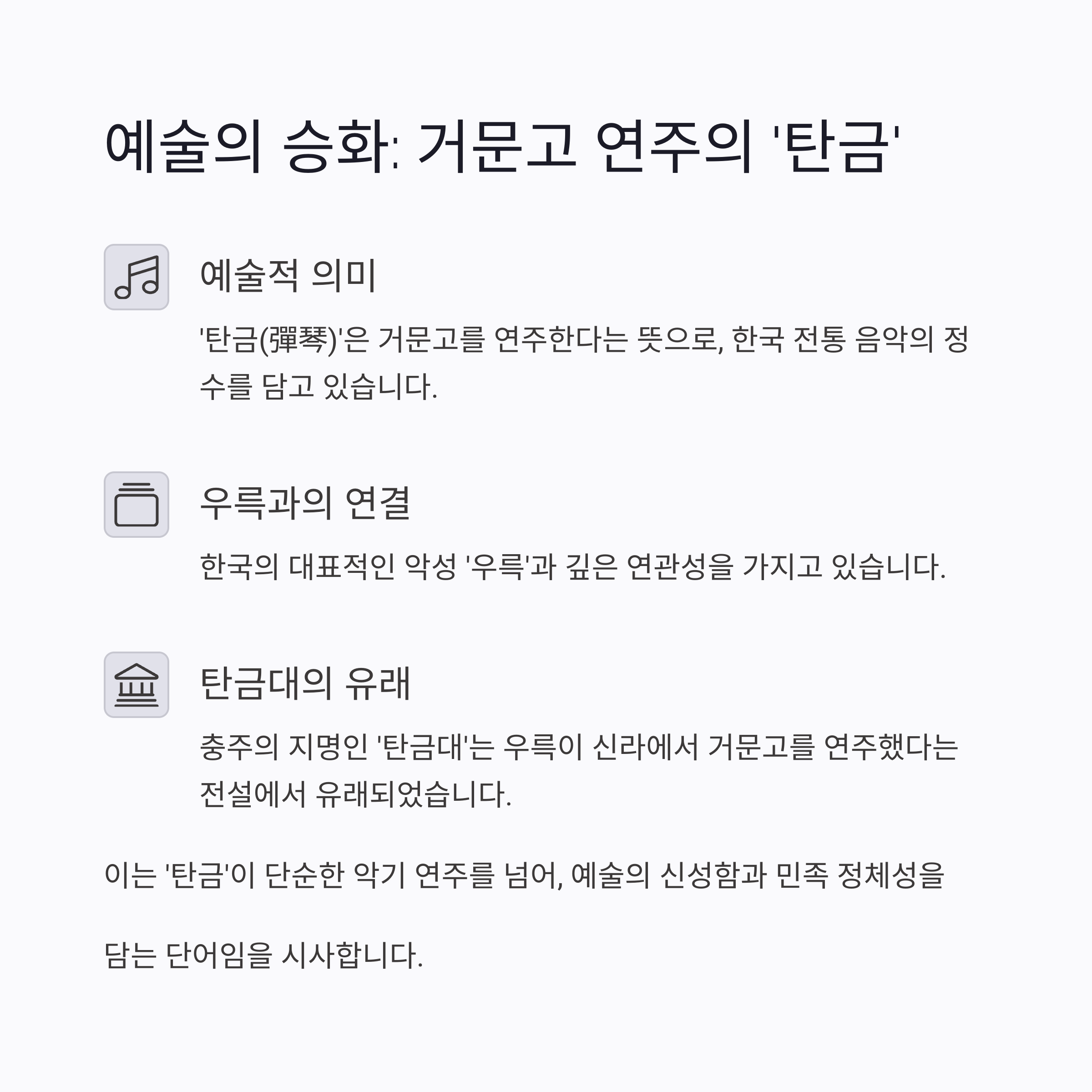 이는 '탄금'이 단순한 악기 연주를 넘어, 예술의 신성함과 민족 정체성을 담는 단어임을 시사합니다.